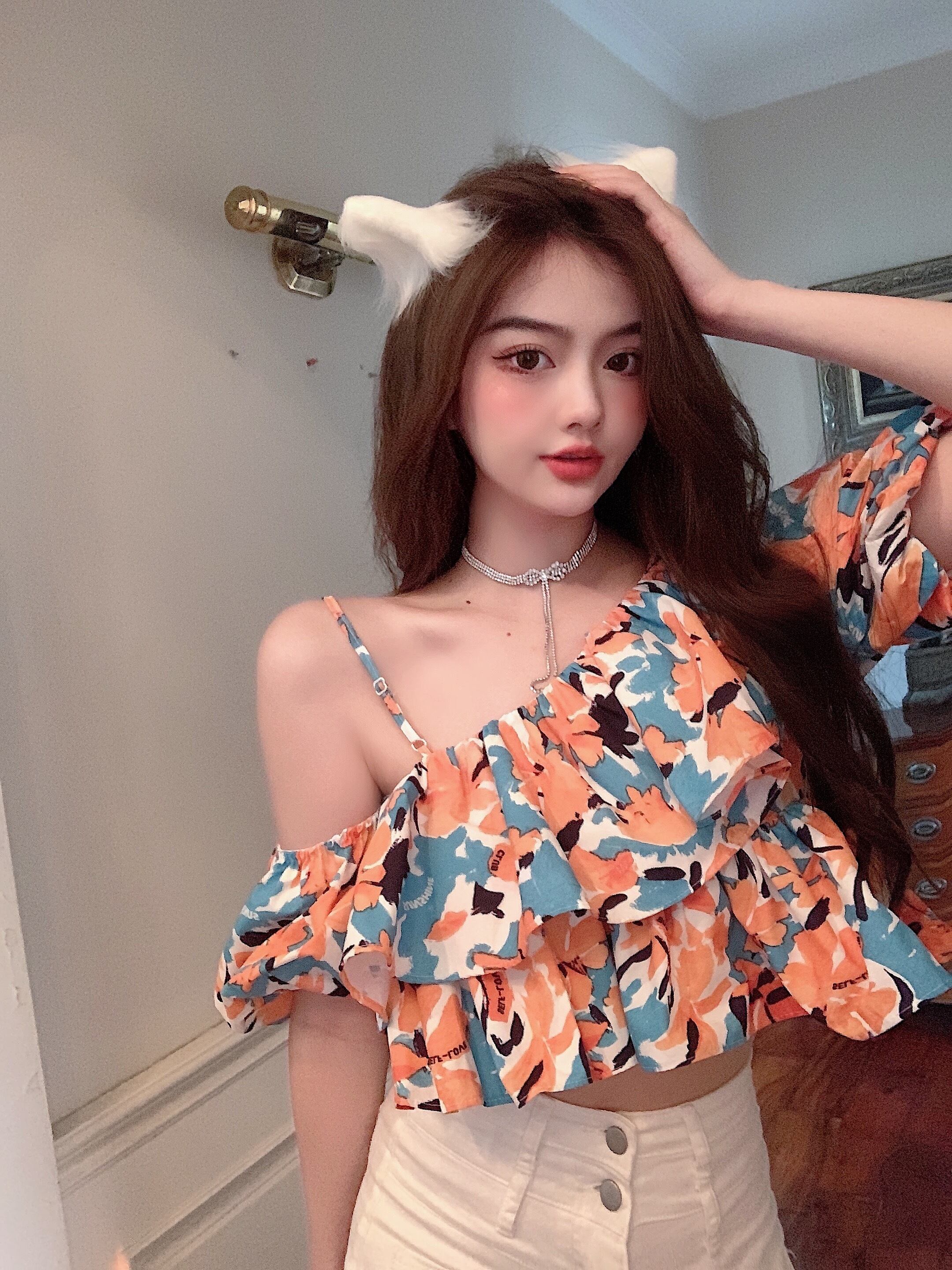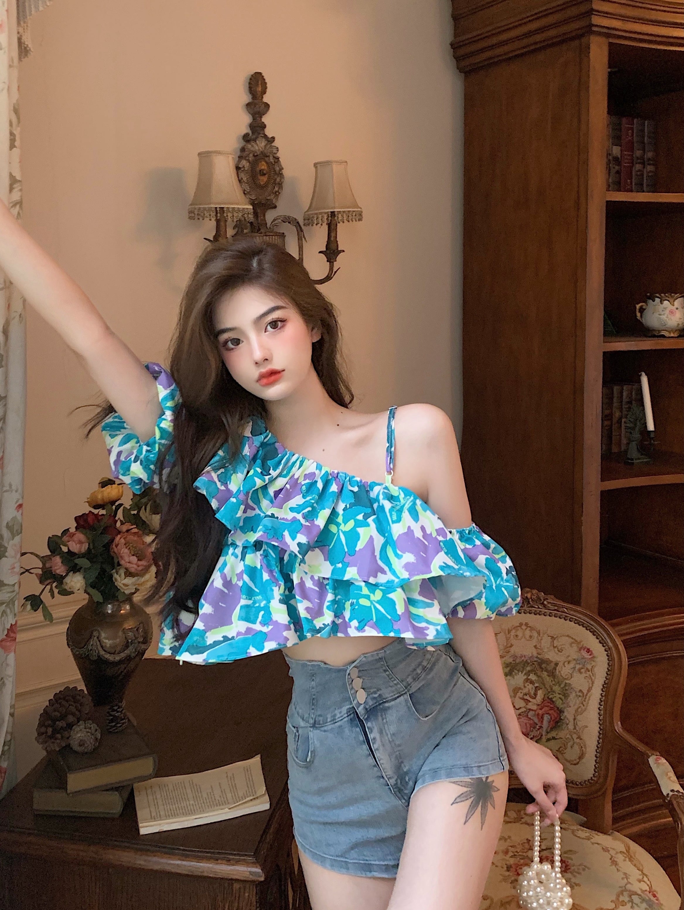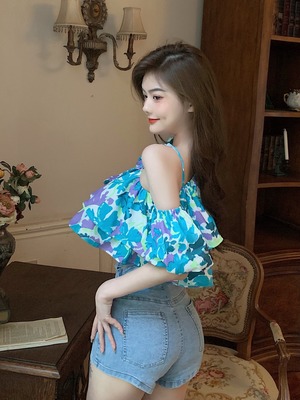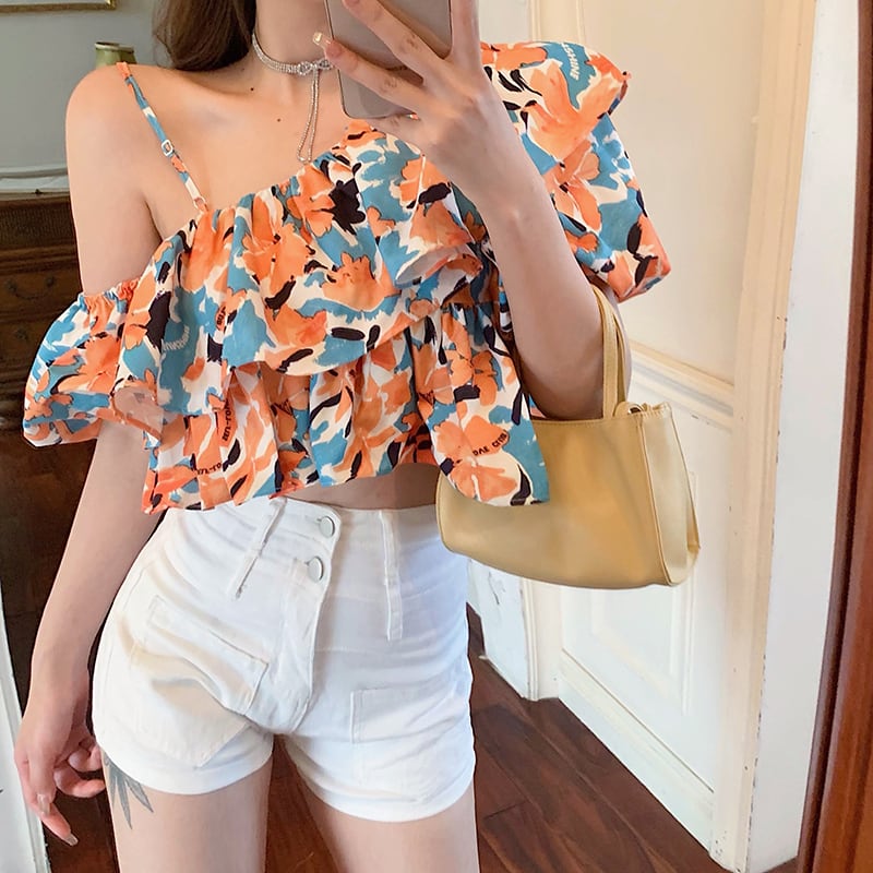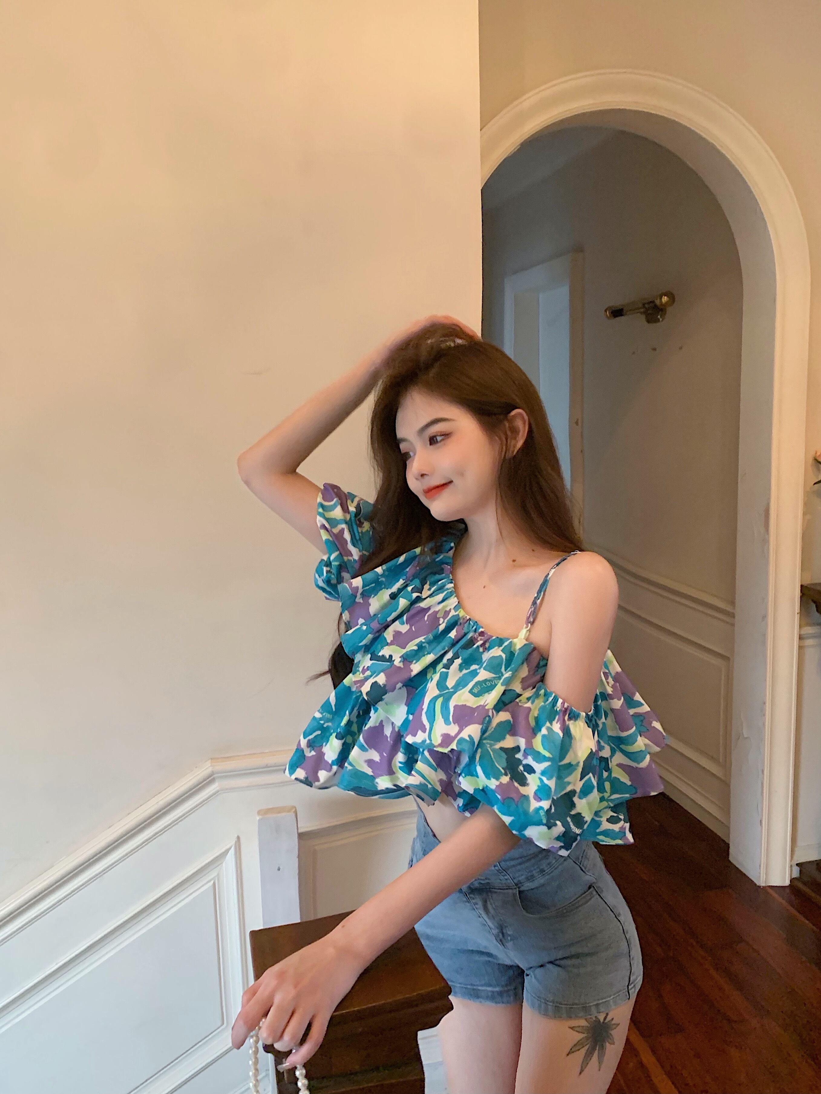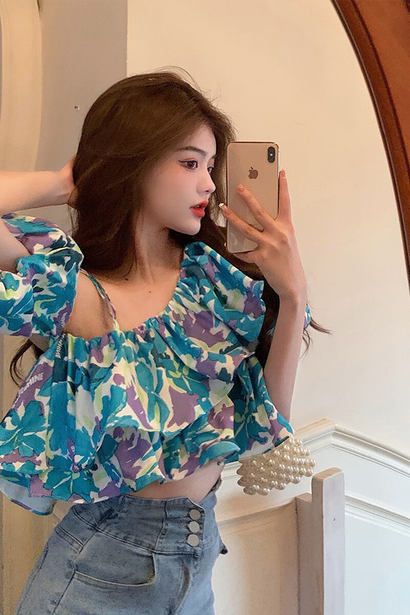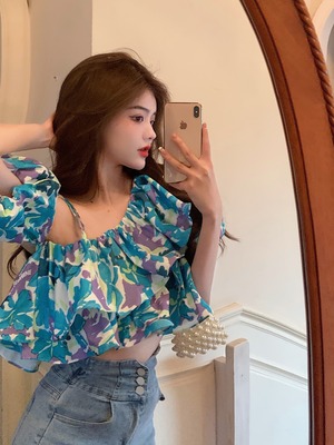 シャツ レディースサマースタンダードショートフローラルブラウス シフォン レトロ 夏物 花柄 オフショルダー セブンプリンセス20221821165