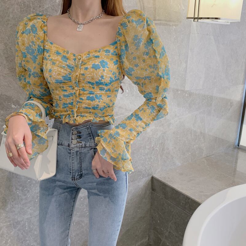 シフォンシャツ レディーススプリングスタンダードスリムショートフローラルスタイルカラートップス ロング レトロ 春物 花柄 スクウェア セブンプリンセス23026642206