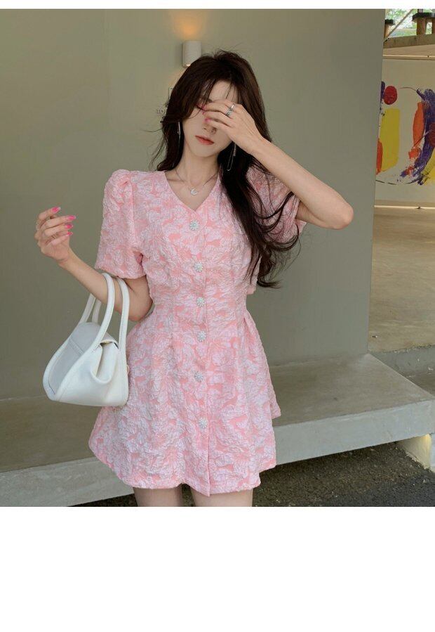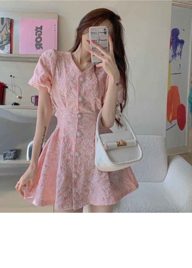 スリーブドレス サマースタンダードジャカードウェストVネックAラインスカート ショート レトロ 夏物 セブンプリンセス84816157679