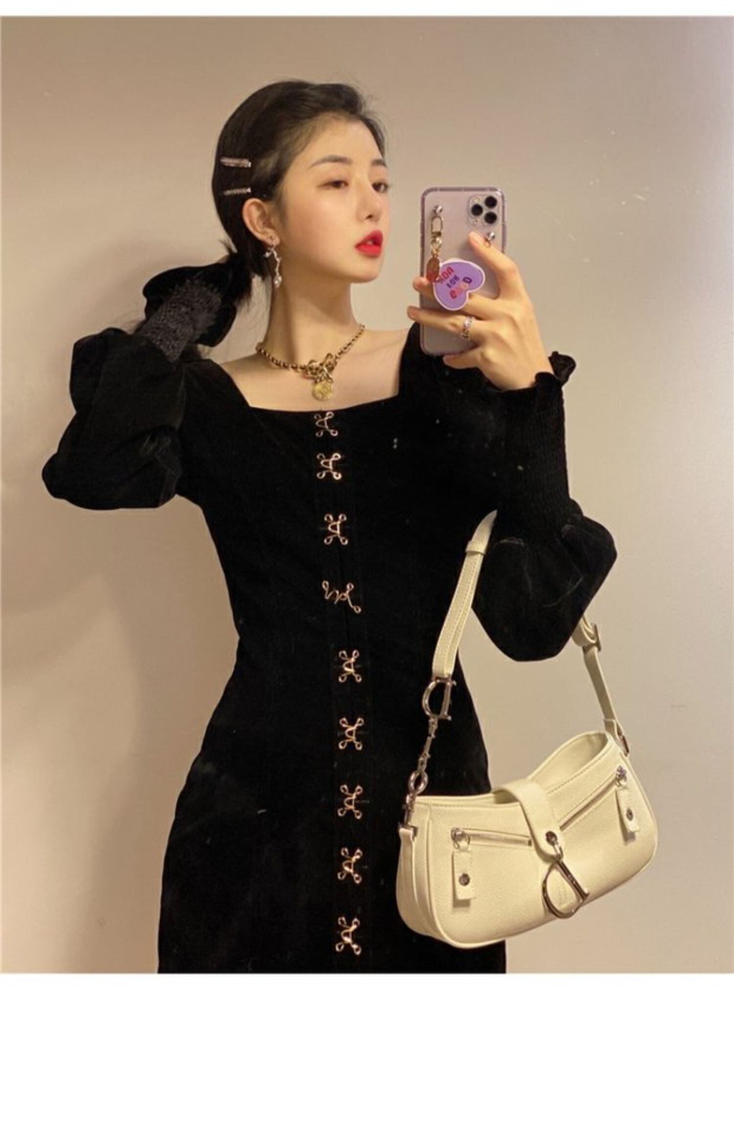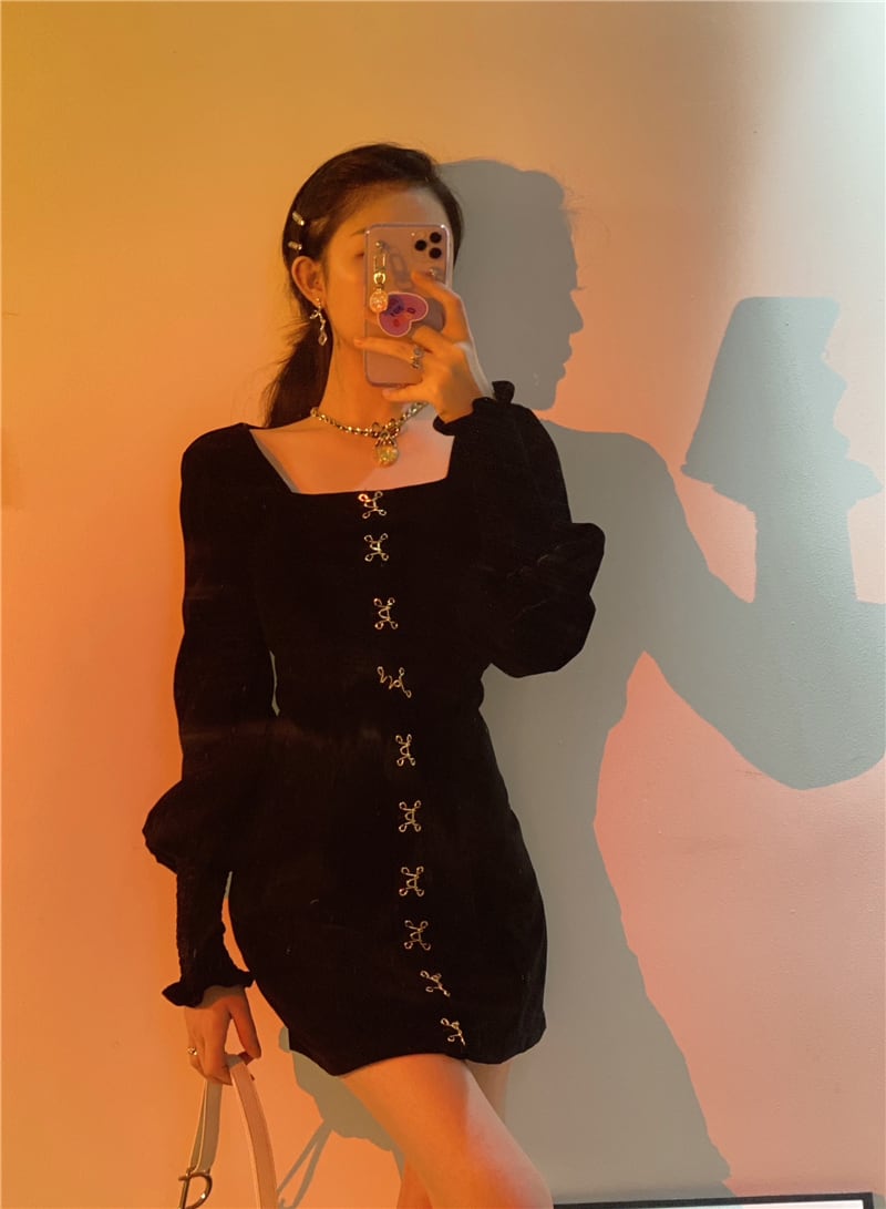 スタイルドレス スプリングスタンダードウェストベルベットスカート ブラック ロング レトロ 春物 セブンプリンセス84470802841
