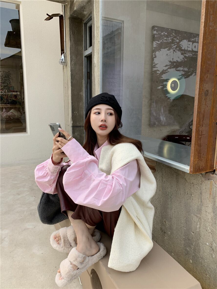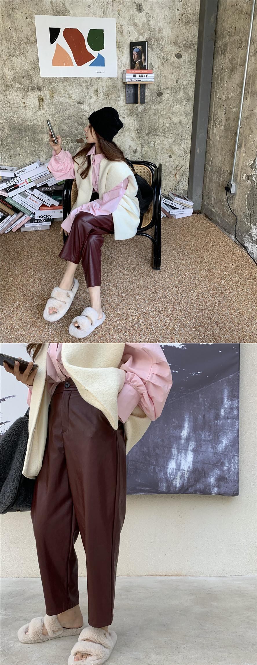 色:ピンクのシャツ,白いベスト,赤い革のズボン