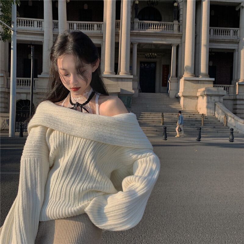 ホワイトセーター レディースルーズスプリングスタイルニットトップス ロング 春物 オフショルダー セブンプリンセス10298337017