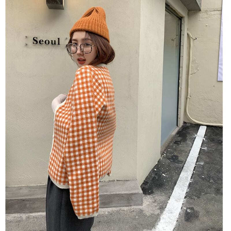 オレンジ格子柄カーディガンセーター ジャケット ニット スプリングルーズスタイル長袖スリーブトップス ロング 春物 セブンプリンセス22850901655