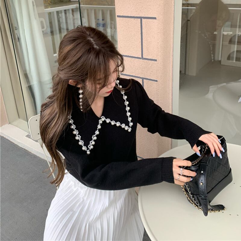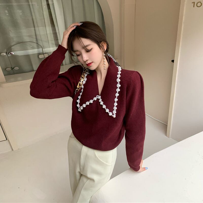 スタンダードスタイルセーター スプリングパールルーズショートニットトップス レトロ 春物 真珠 セブンプリンセス47450347204