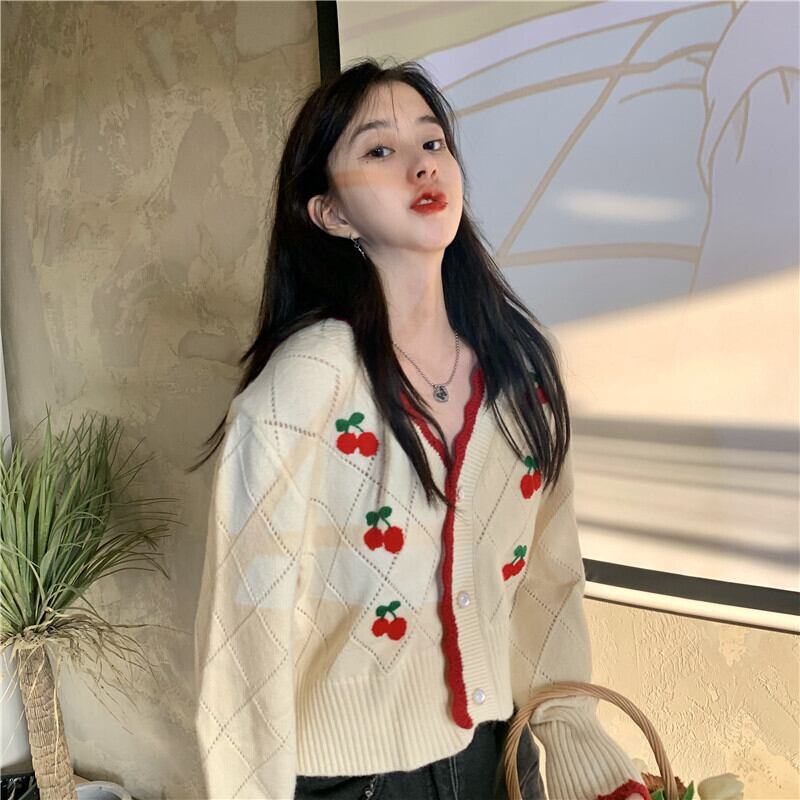 Vネックセーター カーディガンジャケット ニット スプリングルーズショートトップス ロング レッド 刺繍 大人ガーリー スウィート キュート カジュアル 春物 セブンプリンセス1314309360