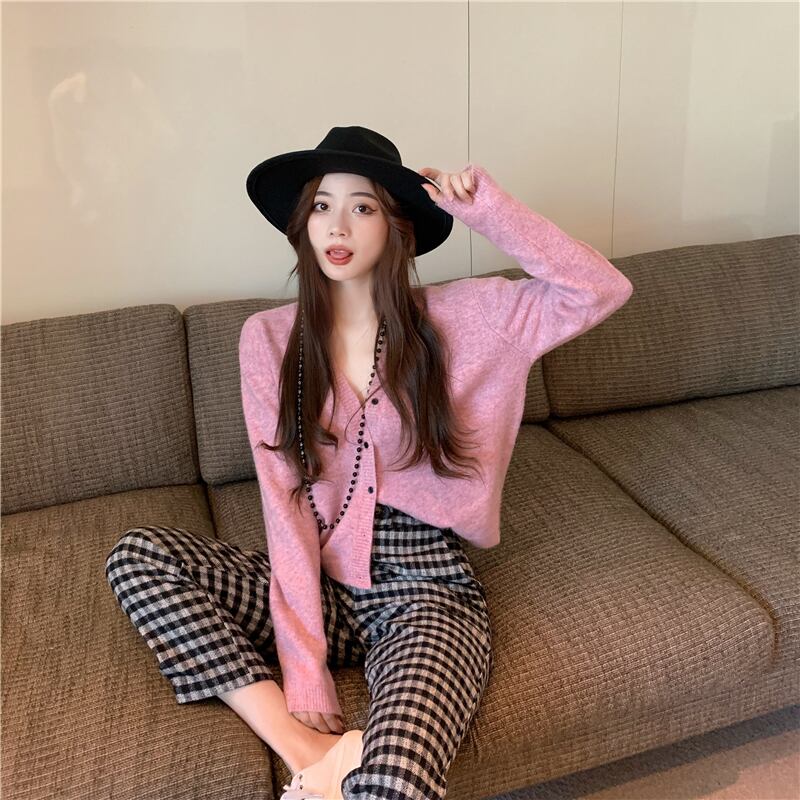 色:ピンクのカーディガン,黒と白のチェックパンツ