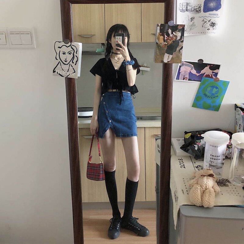 ブラックVネックシャツ スプリングサマースリムショートトップス Tシャツ レース 春物 夏物 レースアップ セブンプリンセス26841800141