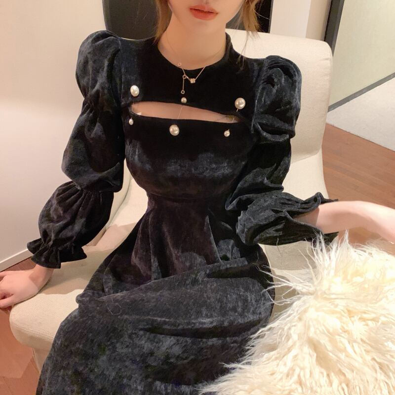 スタンダードドレス スプリングサマーパールボタンスリーブベルベットスカート ウェストロング レトロ 春物 夏物 真珠 セブンプリンセス68593301167