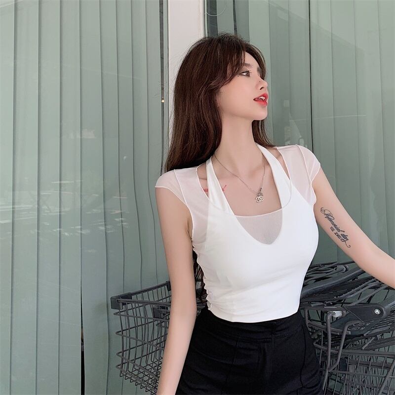 ホワイトレディースショートVネックサマーノースリーブトップス 夏物 セブンプリンセス98367754279
