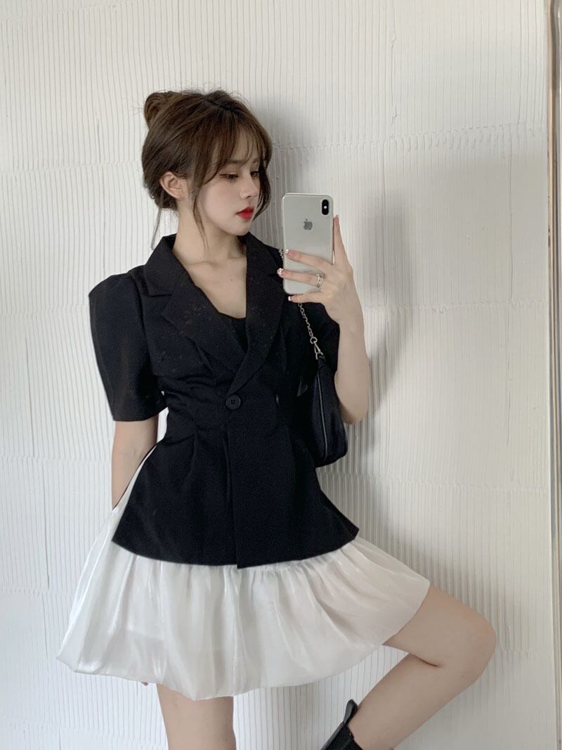 ブラックジャケット サマー薄手Vネックカジュアルスタイルウェストトップス 夏物 セブンプリンセス4820503676