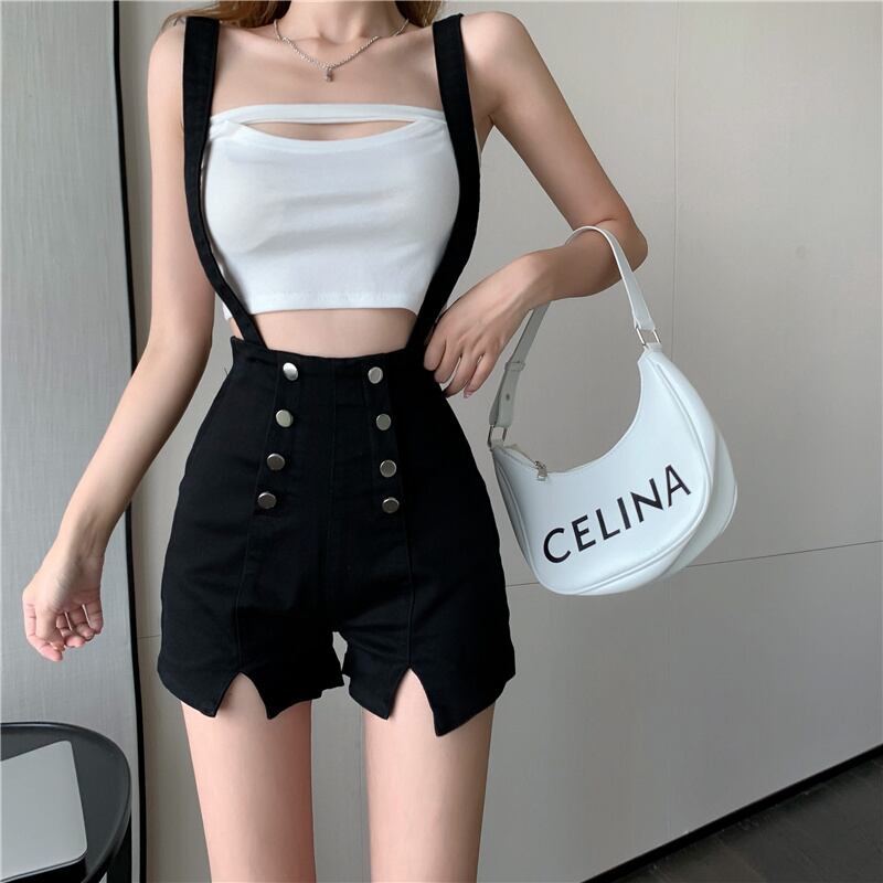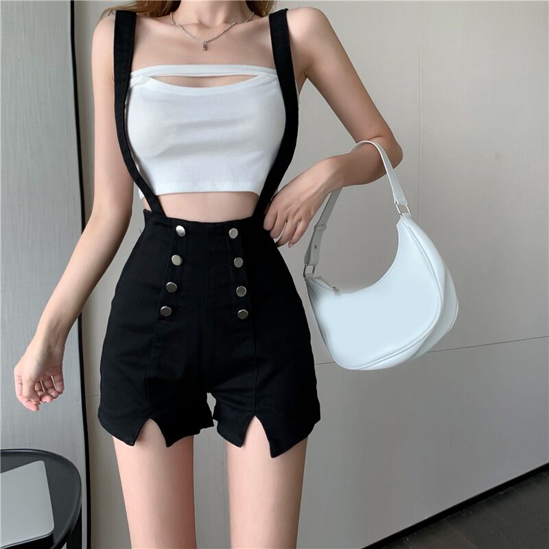 ショーツ サマー薄手パンツ ハイウェストウェストオーバーオール ブラックAライン 夏物 ブルマー セブンプリンセス6441795390