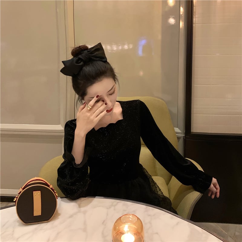スタンダードベルベットドレス スプリングブラックスカート Aライン レトロ 春物 スクウェア セブンプリンセス60433910651