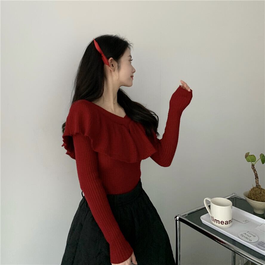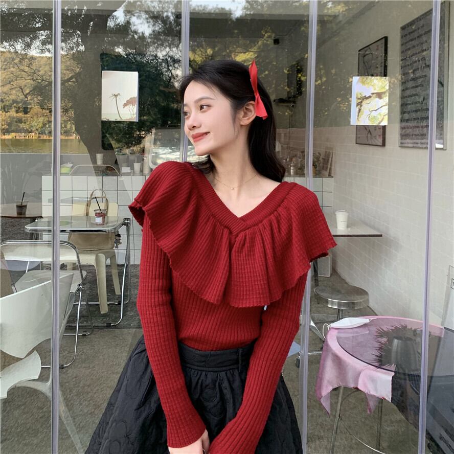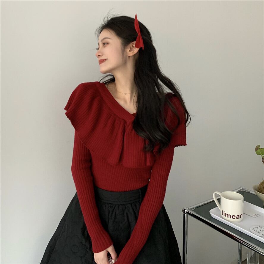 レッドセーター スプリングスリムVネック長袖スリーブトップス ロング 大人ガーリー スウィート キュート カジュアル 春物 セブンプリンセス64772330620