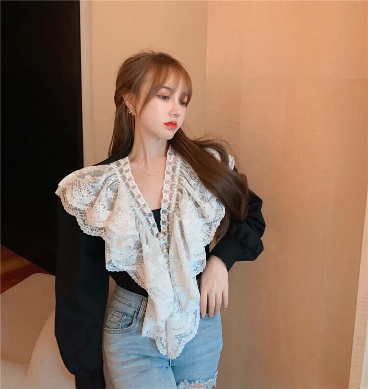 シャツ ホワイトレーストップス スプリングVネック ロング 春物 ステッチ セブンプリンセス35001652562