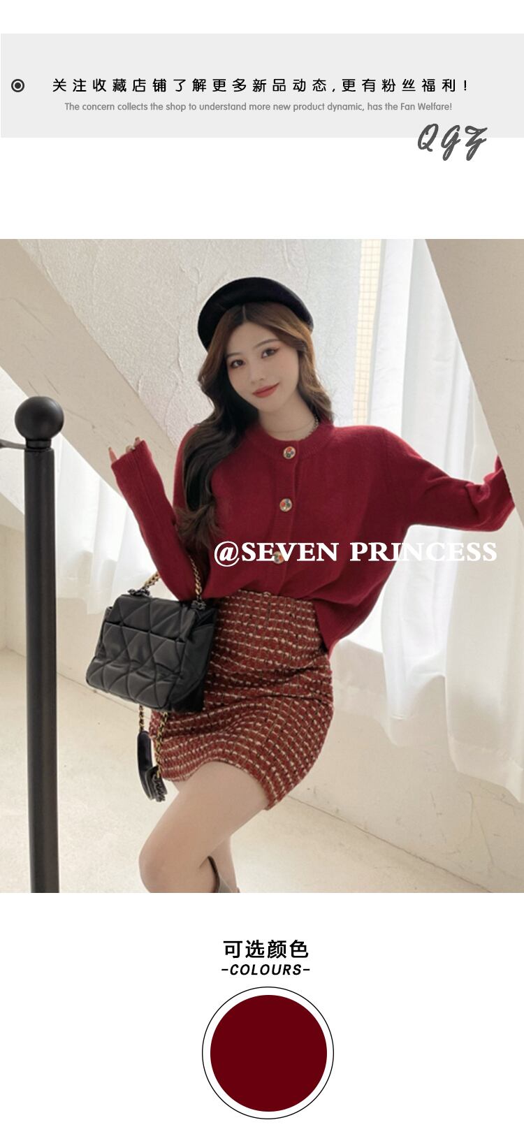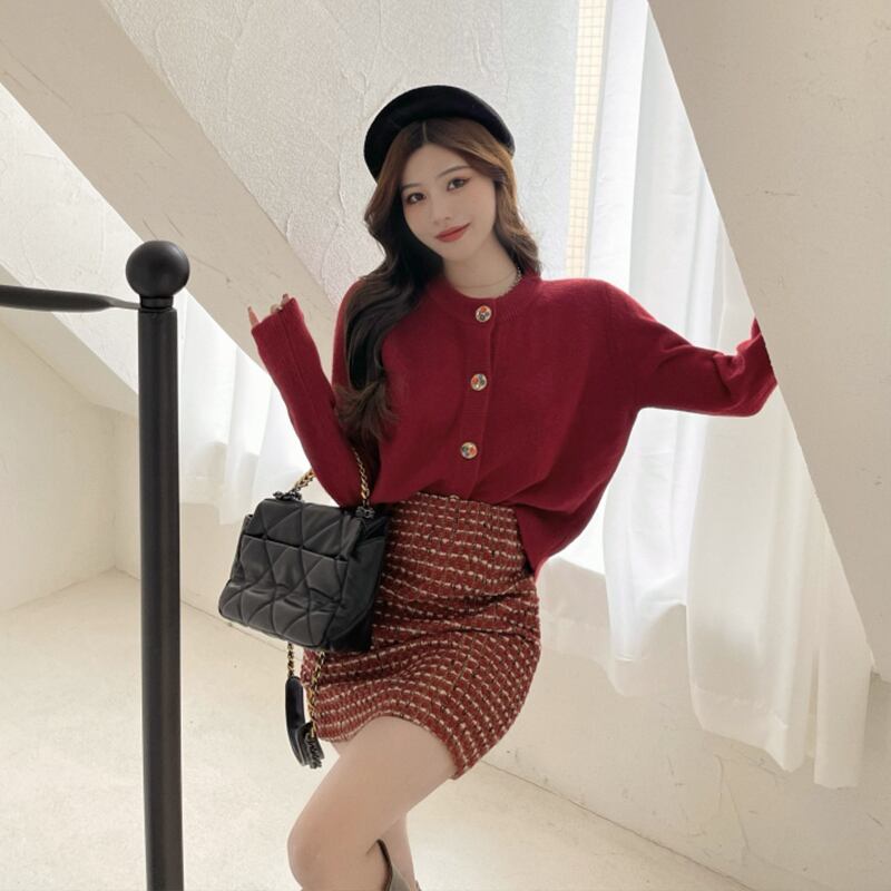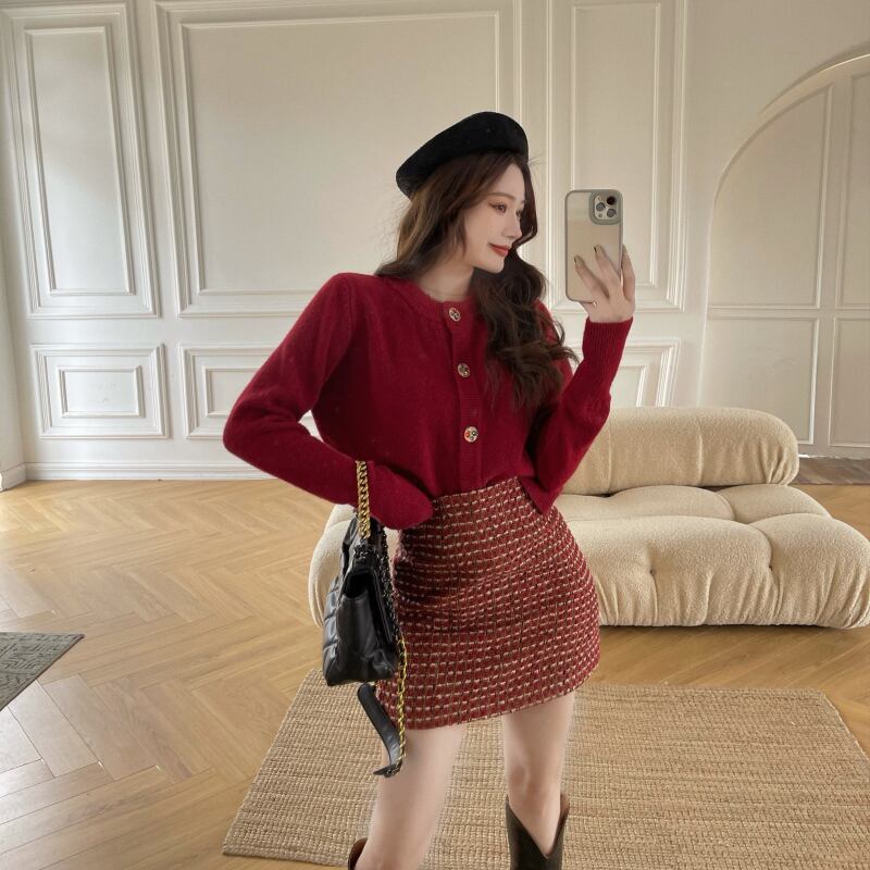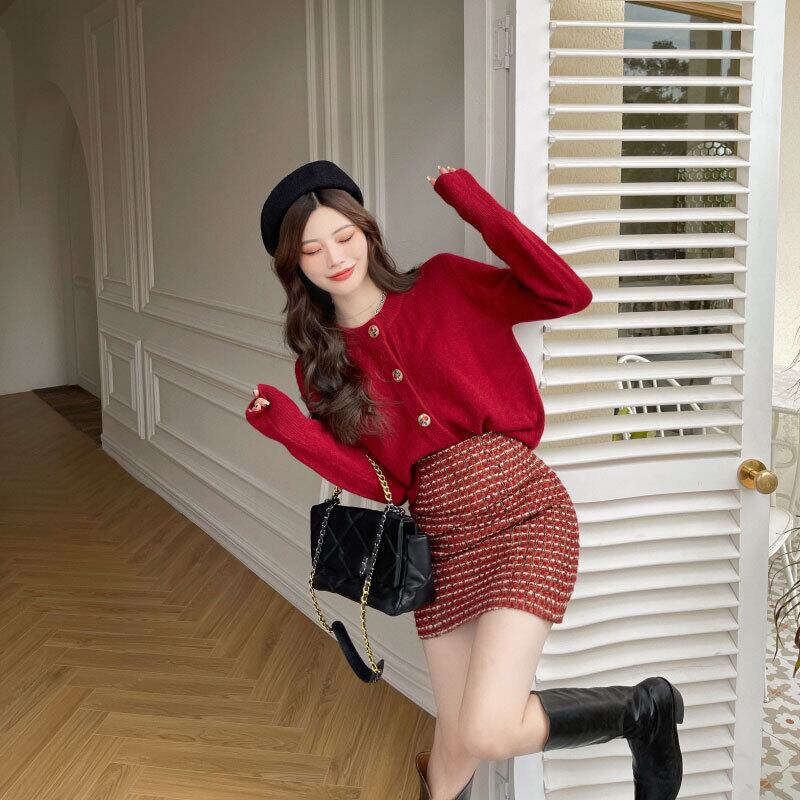 色:ワインレッドのセーター,ウールスカート