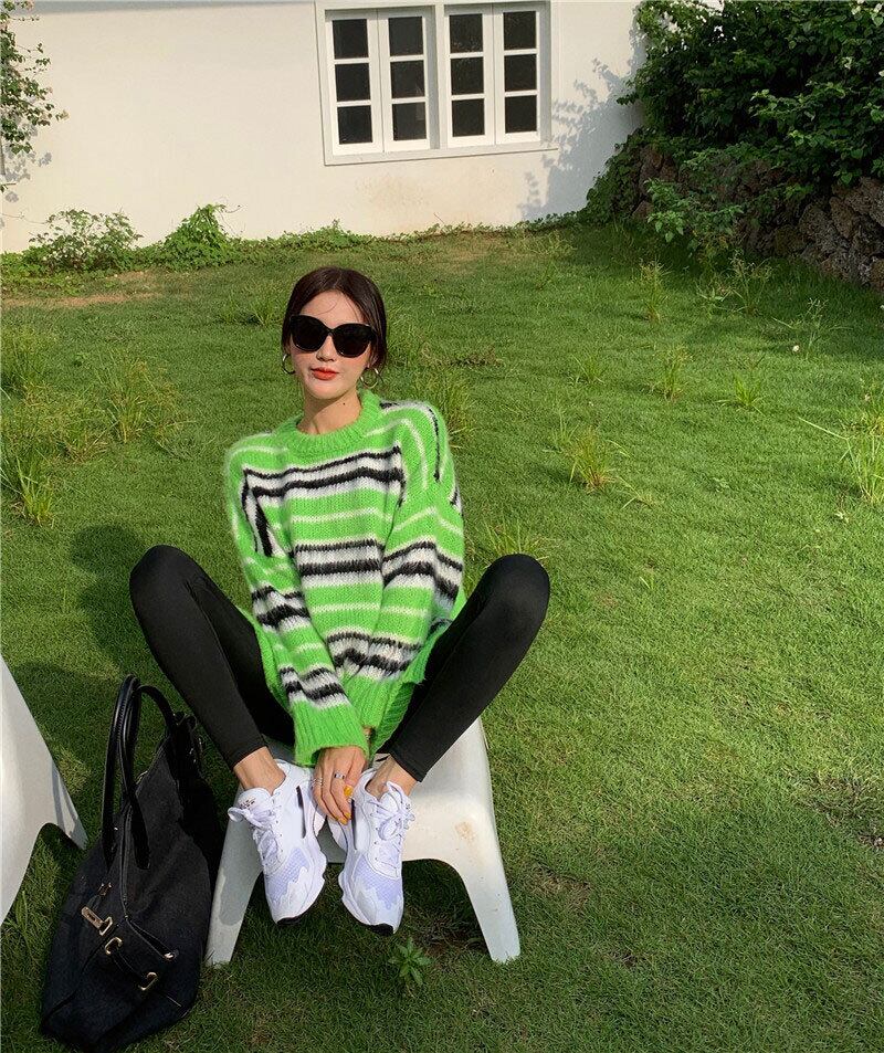 グリーンストライプセーター ルーズスプリングニット長袖スリーブトップス ロング 春物 セブンプリンセス32596330622