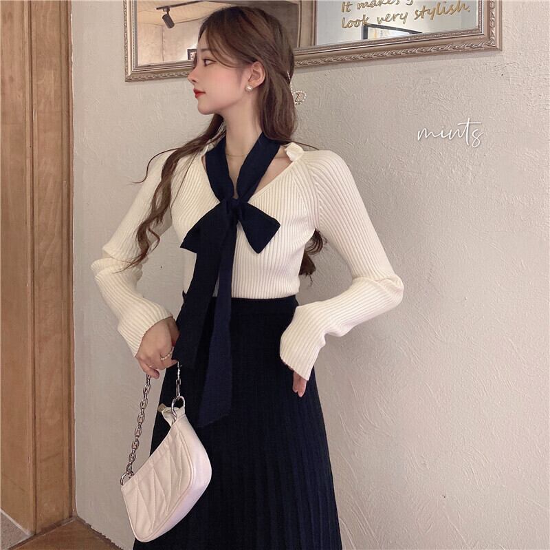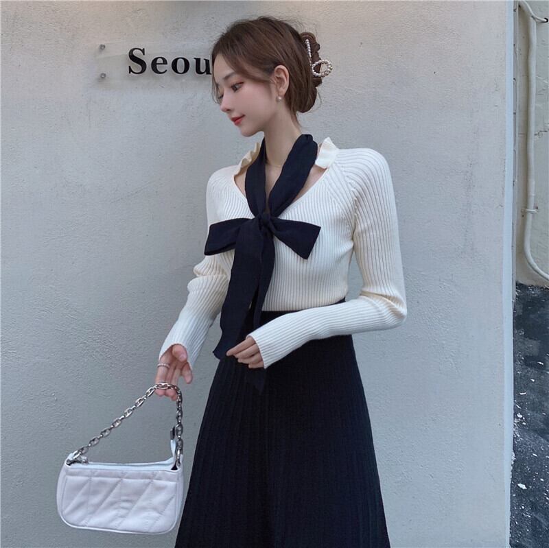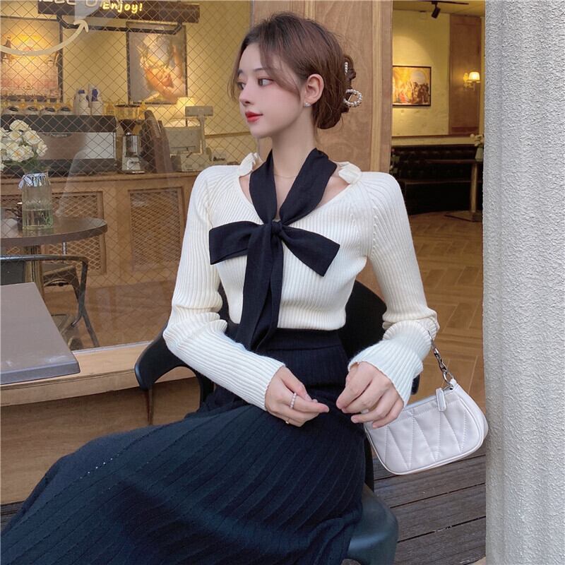 ホワイトセーター シャツ レディーススプリングスリムリボンニットスタンダードプルオーバー トップス ロング レトロ 春物 セブンプリンセス26227788401