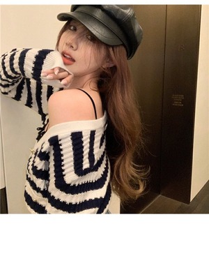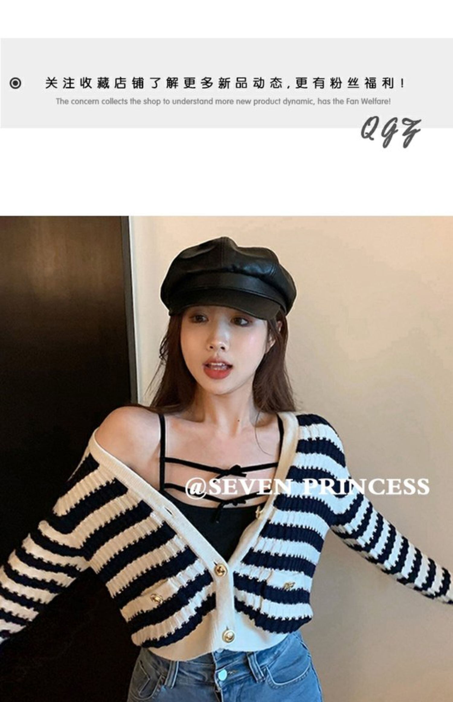 セーター カーディガンスプリングサマースタンダードショートVネックストライプコート ジャケット レトロ 春物 夏物 セブンプリンセス70066806645