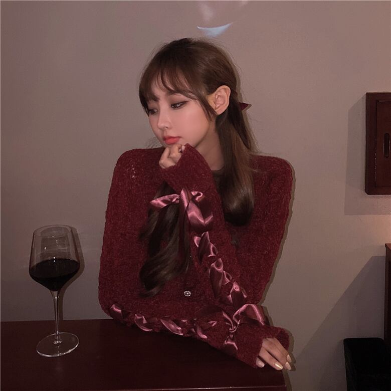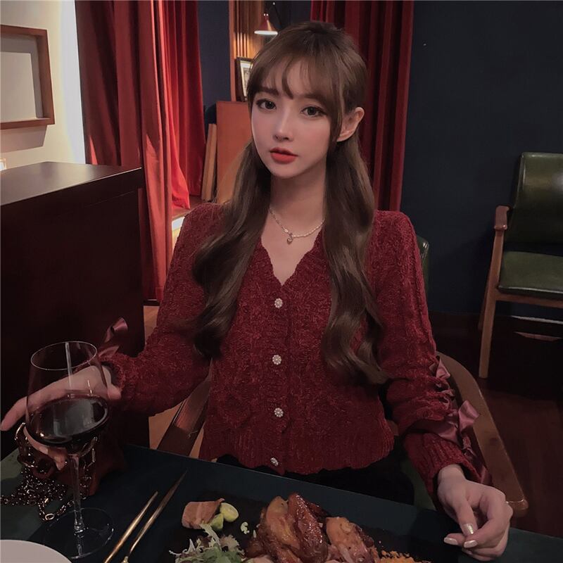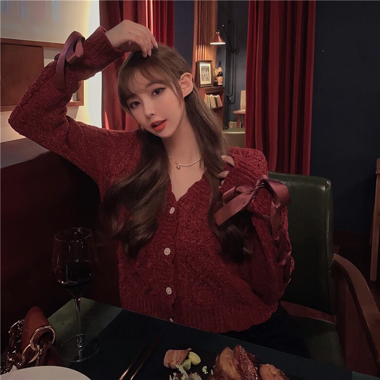 レッドVネックセーター カーディガンジャケット ニット スプリングルーズショート長袖スリーブトップス ロング リボン 春物 セブンプリンセス36045692920