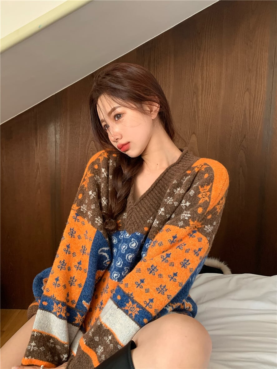 スタンダードVネックセーター レディースルーズスプリングスタイルトップス ロング レトロ 春物 セブンプリンセス16178345248
