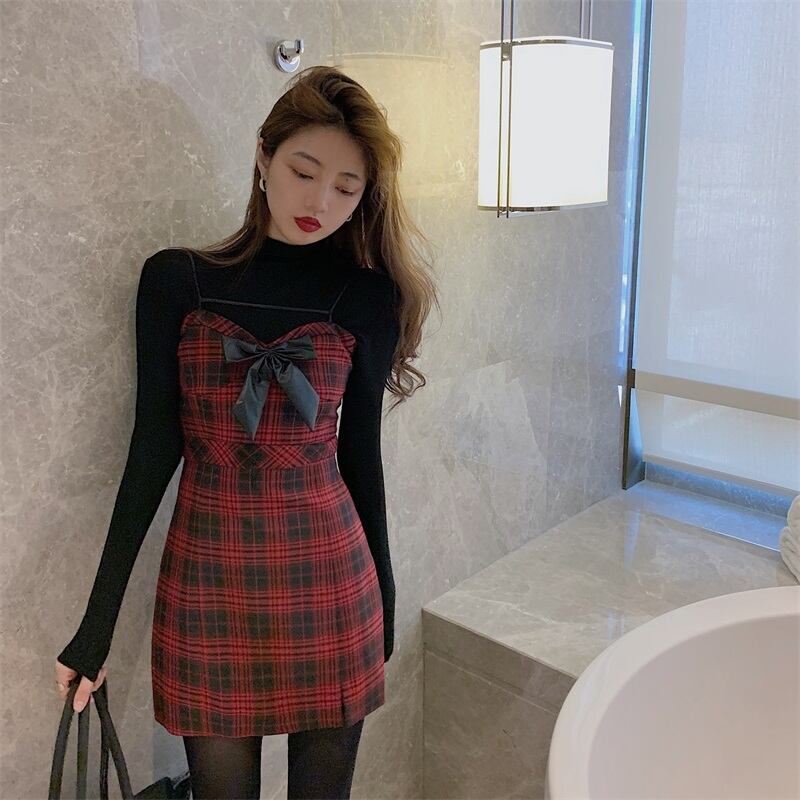 レッド格子柄ドレス スプリングウェストスリムリボンレザースカート 春物 セブンプリンセス29917804033