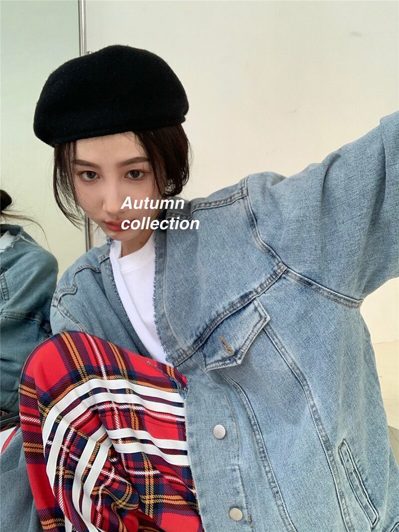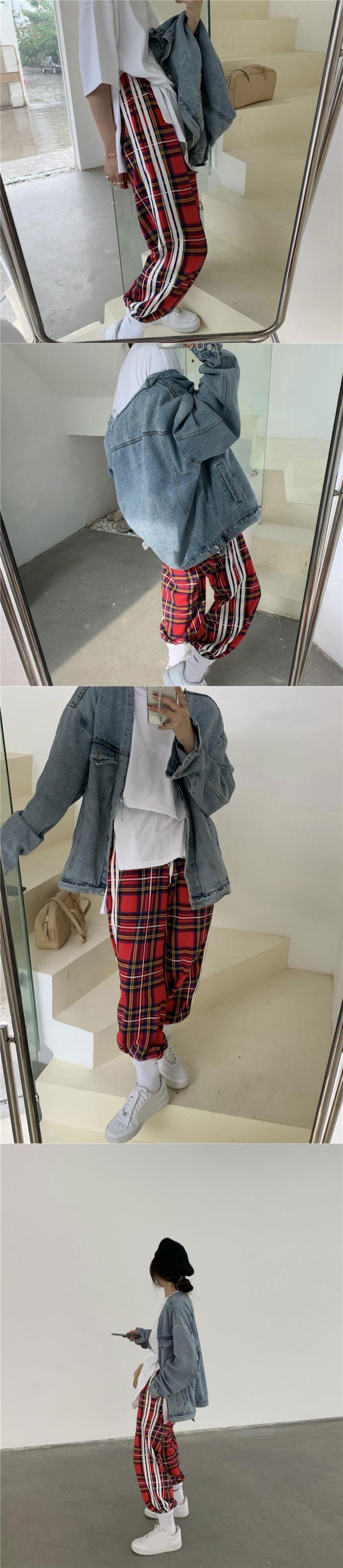 色:赤いチェック柄パンツ,ライトブルーデニムジャケット