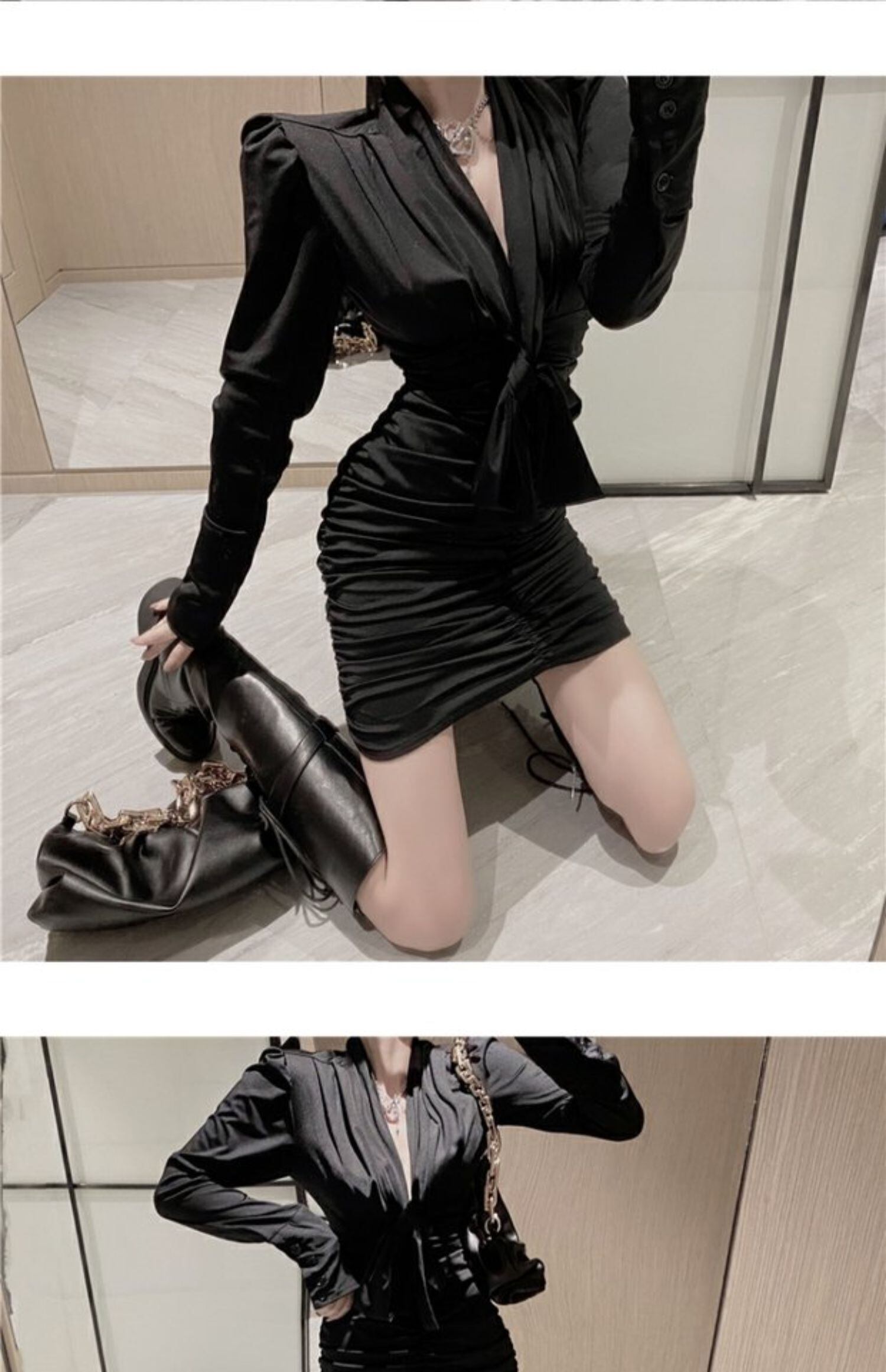 スタンダードVネックドレス スプリングウェストブラックスリム レトロ 春物 スカート セブンプリンセス45008344744