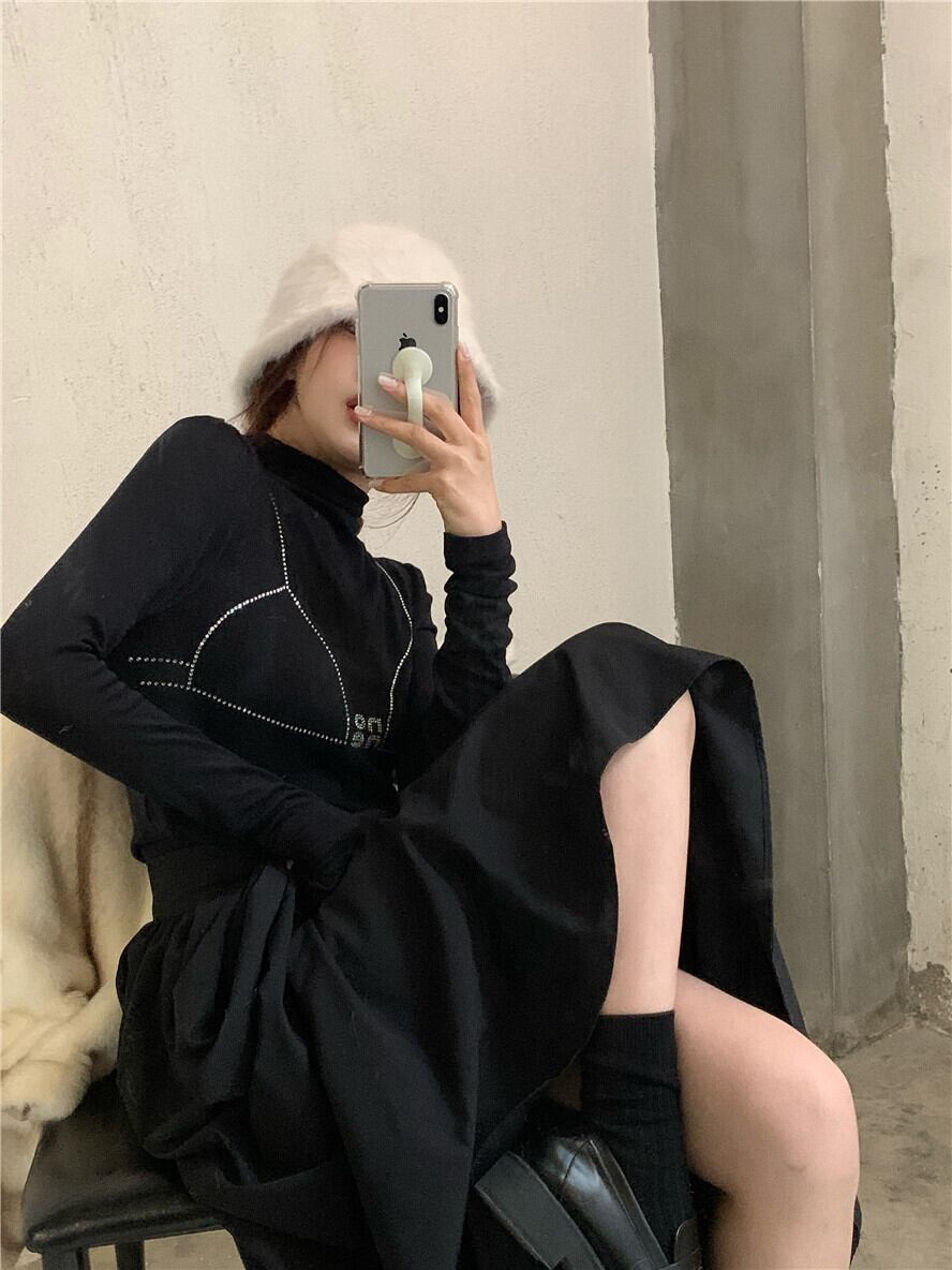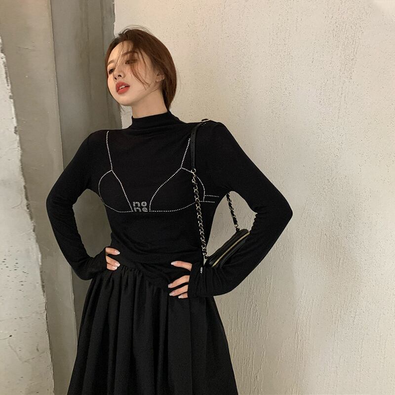 ブラックカラーシャツ スプリングトップス スリムTシャツ ロング 春物 セブンプリンセス3182133007