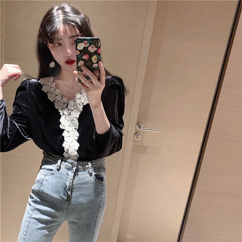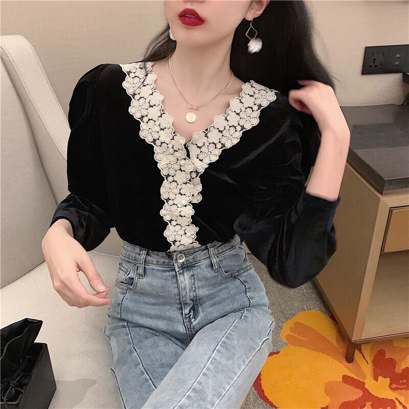ベルベットシャツ スプリングVネックルーズレースブラウス スタンダードスタイル ロング レトロ 春物 セブンプリンセス57677711459
