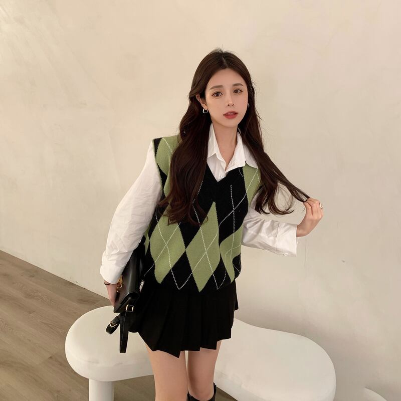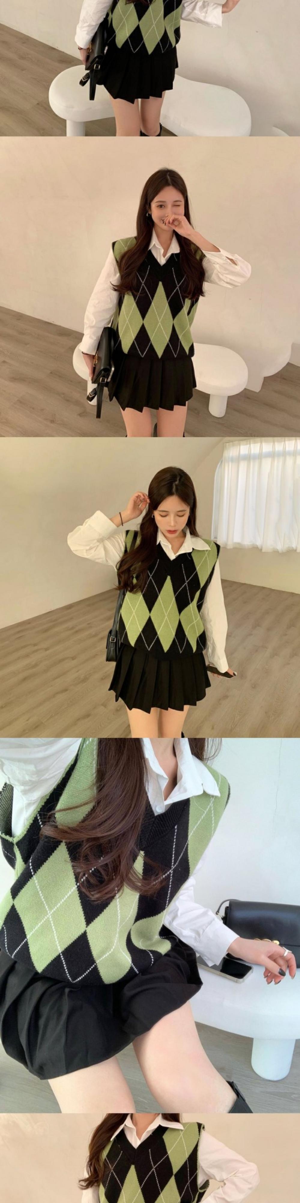 色:白のシャツ,ピンクのシャツ,ピンクのベスト,黒スカート,グレースカート,グリーンベスト