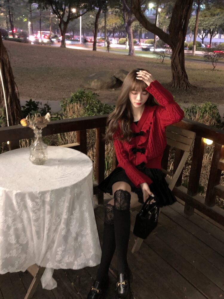 レッドセーター スタイルオータムウィンタースタンダードリボンVネックスリムショートトップス レディース レトロ 秋物 冬物 セブンプリンセス95364195714