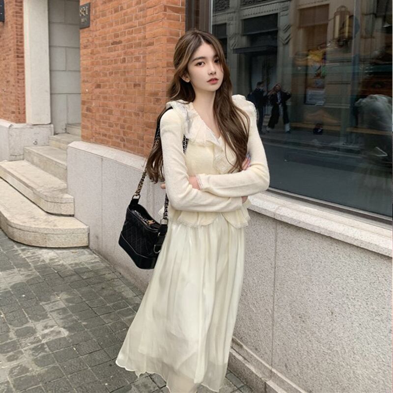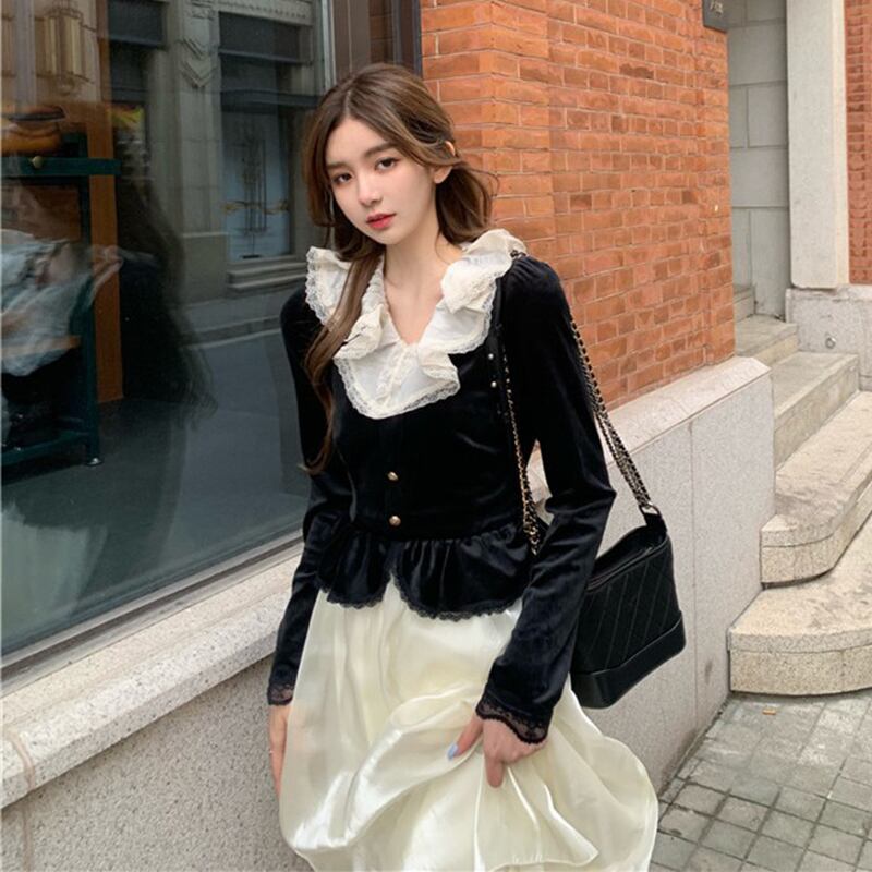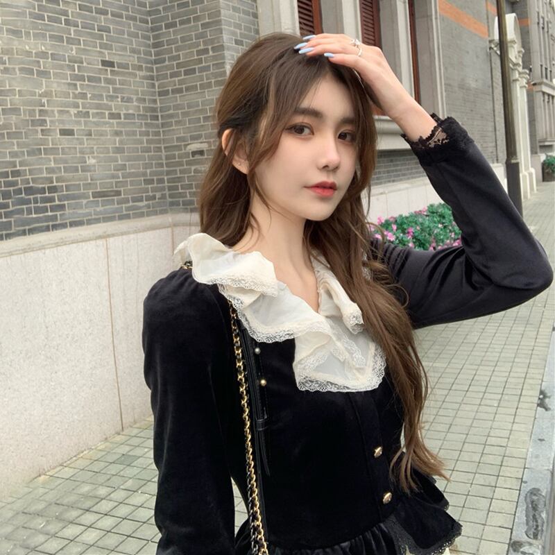 スタンダードドレス スプリングロングレースウェストベルベットスカート レトロ 春物 セブンプリンセス82866797592