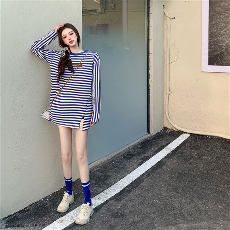 スプリングストライプTシャツ シャツ ルーズトップス ロング 春物 セブンプリンセス32257065007