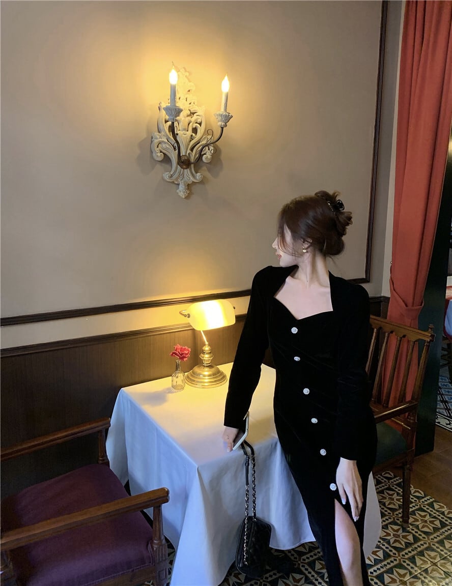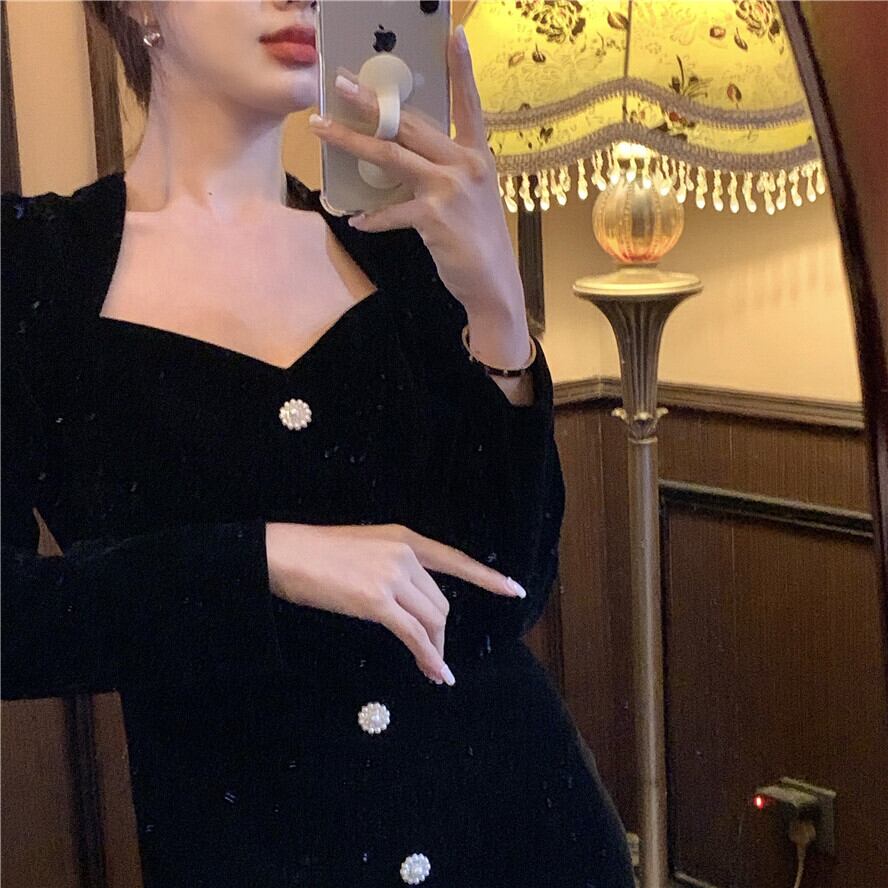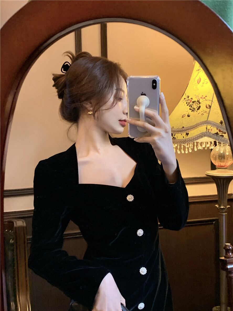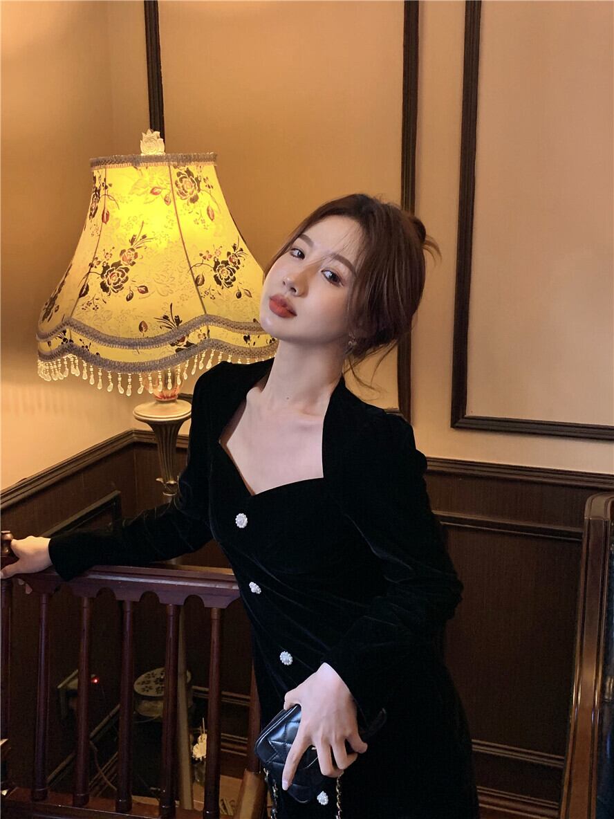 ブラックベルベットドレス スプリングサマーウェストロングスカート スタンダード レトロ 春物 夏物 セブンプリンセス70400932198