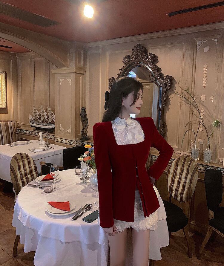 レッドベルベットジャケット オータムウィンタースタンダードスタイルウェストカーディガンシャツ レトロ 秋物 冬物 セブンプリンセス12994848502