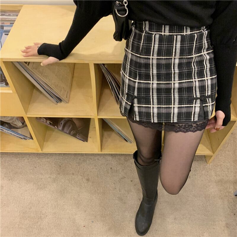 ダーク格子柄スカート スプリングレースAラインウェストショート 春物 ステッチ セブンプリンセス75053656897