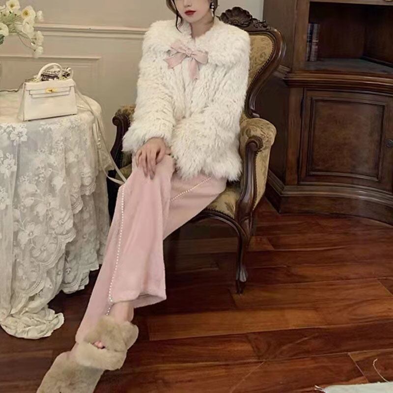 ファーフェイクコート スプリングルーズトップス レディース リボン コットン 春物 セブンプリンセス63125379794