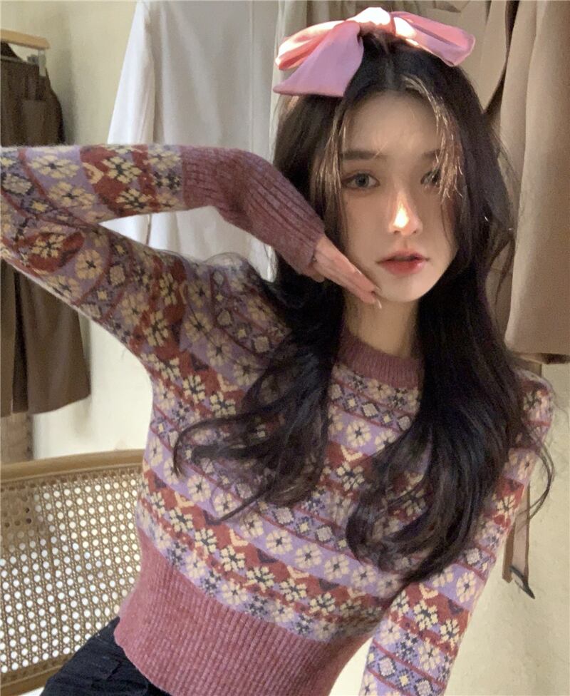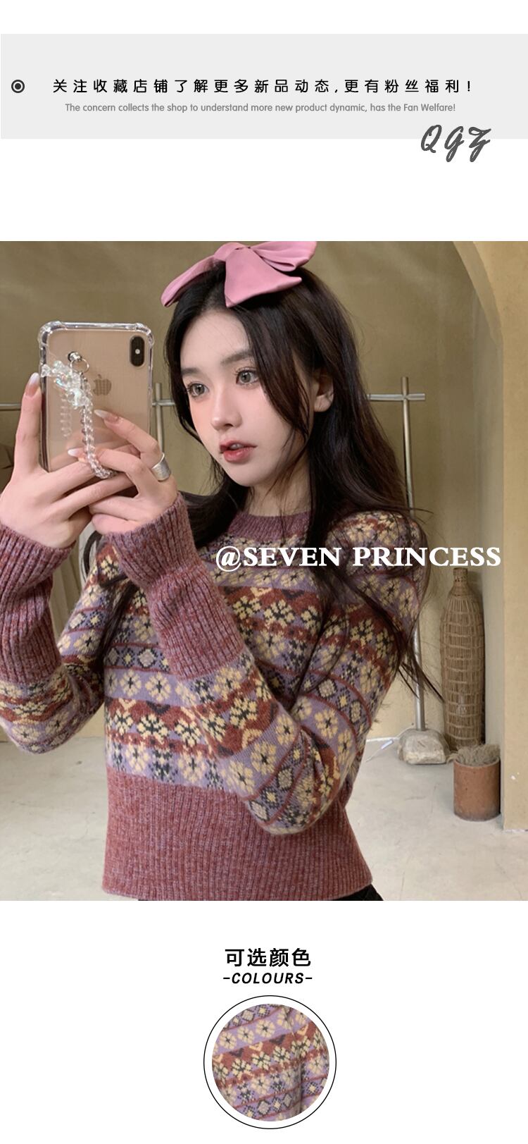 セーター スタイルフローラルスタンダードスプリングサマースリムショートブラウス ラウンドネックプルオーバー レディース ロング レトロ 春物 夏物 花柄 Oネック セブンプリンセス71468292092