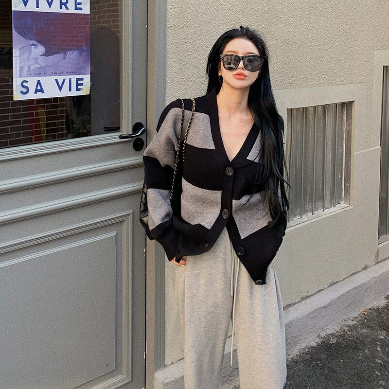 セーター カーディガンスプリングルーズストライプVネックトップス 春物 セブンプリンセス52627193107