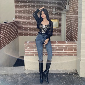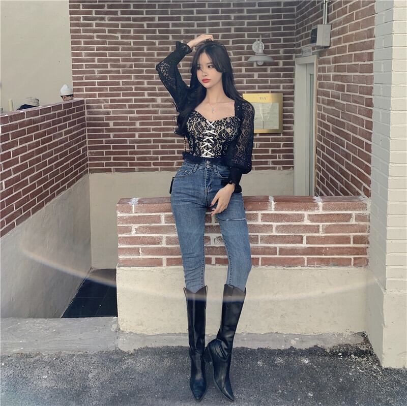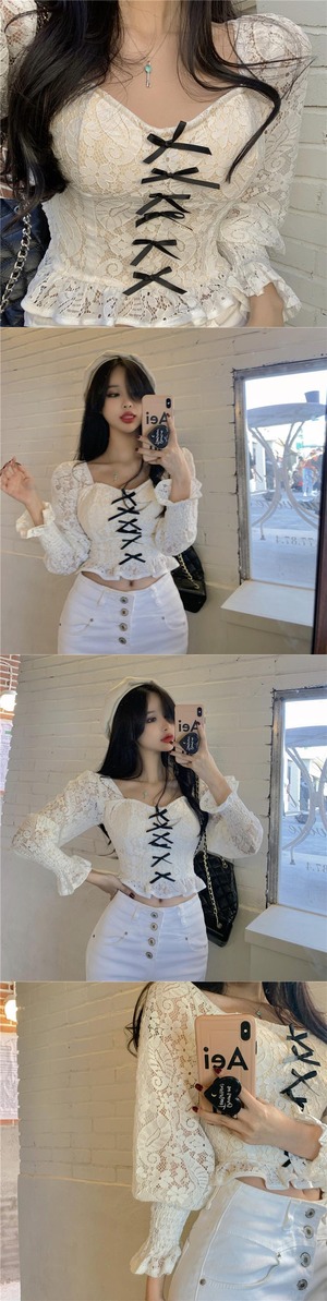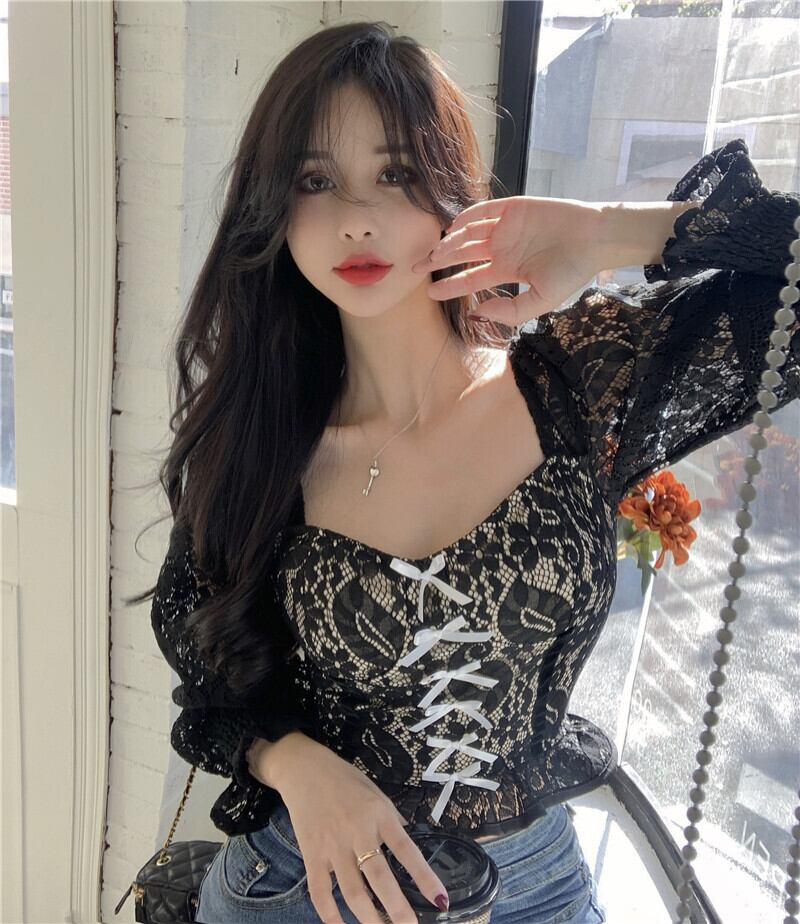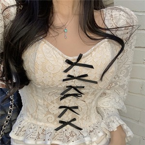 ブラックレースシャツ スプリングショートスタイルリボントップス 春物 セブンプリンセス91500906099