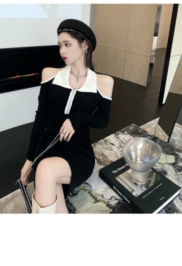 ニットドレス スプリングサマースタイルスタンダードウェストスカート ロング レトロ 春物 夏物 オフショルダー セブンプリンセス60014967871