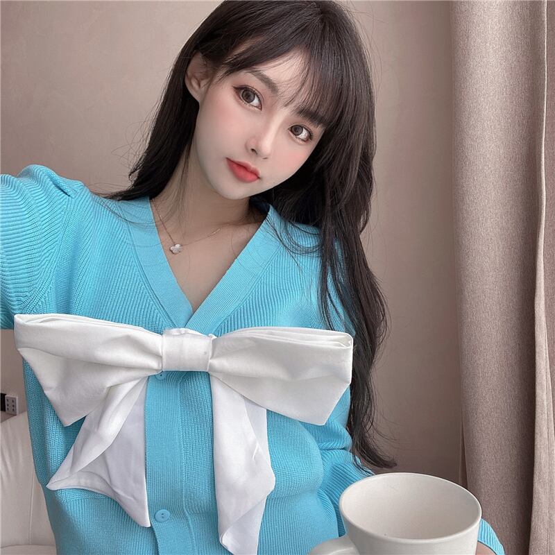 Vネックニットセーター レディースカラーリボンスリムショートブルーカーディガントップス オータムウィンター 秋物 冬物 セブンプリンセス92054180691