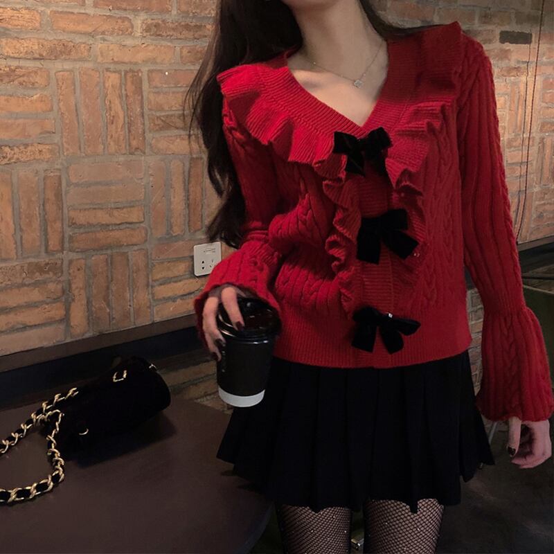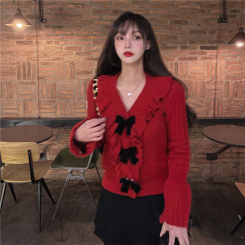 レッドVネックセーター スプリングサマーニットシャツ トップス 春物 夏物 セブンプリンセス24415239023