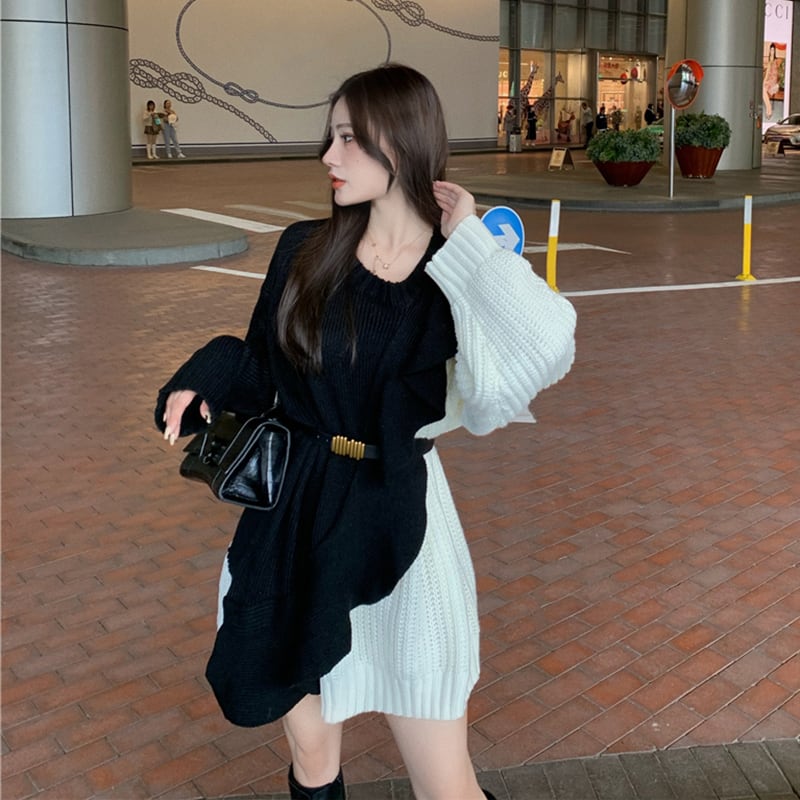 色:黒と白のステッチセーター,ベルト