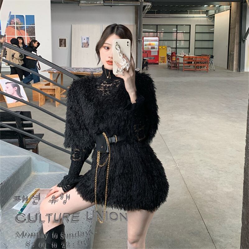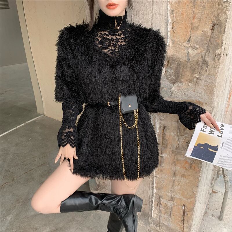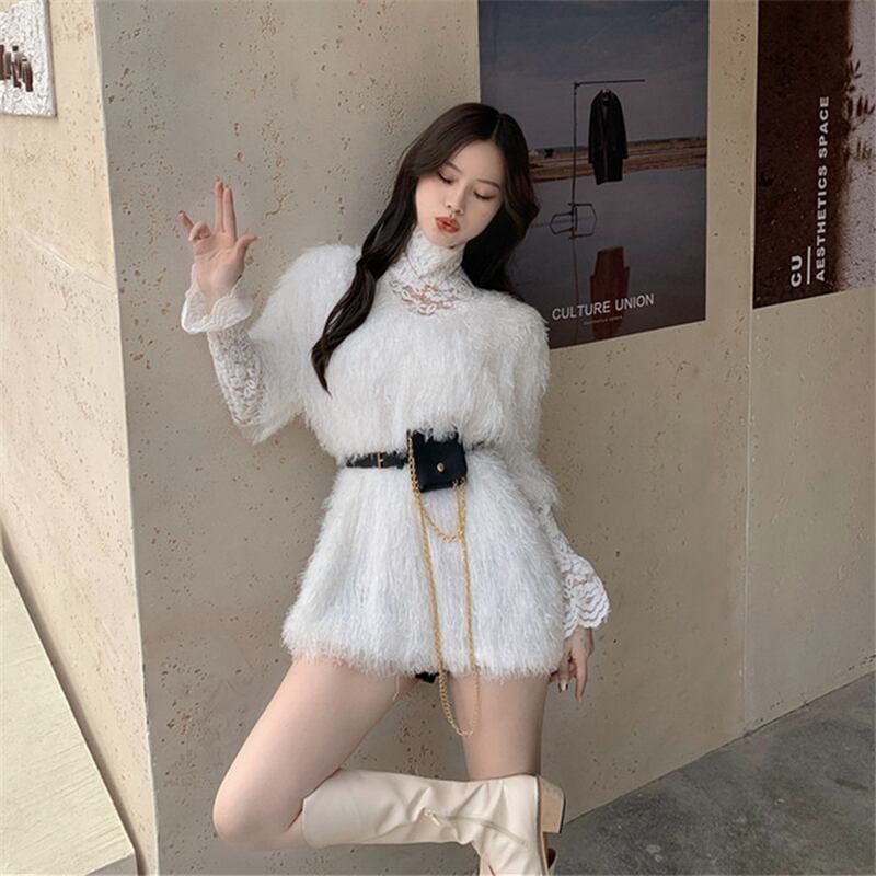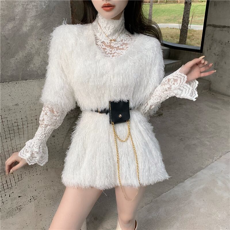 色:白いレースのシャツ,ホワイトウールセーター,ブラックレースシャツ,ブラックウールセーター,ベルト