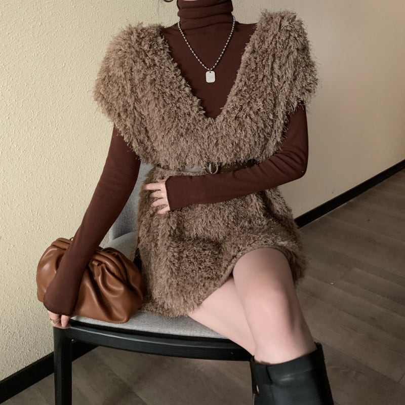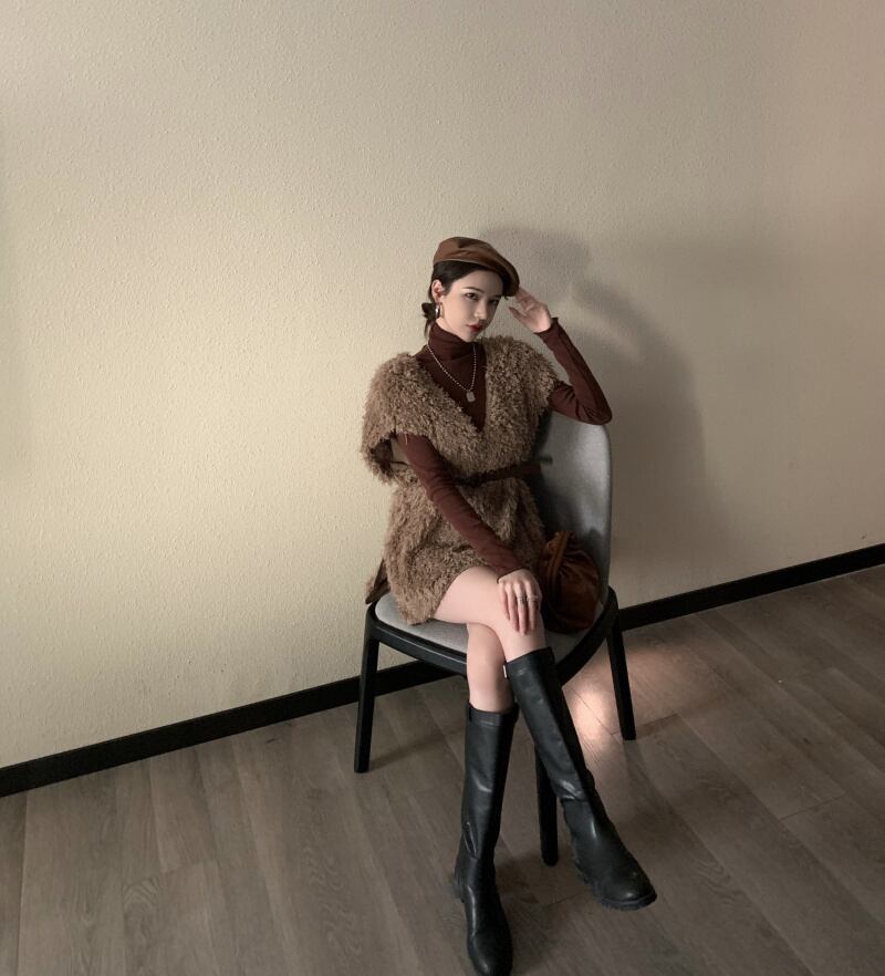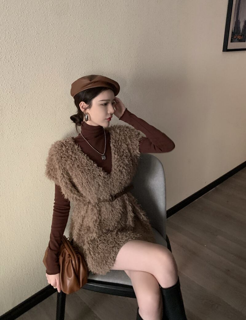 色:コーヒー色のボトミングシャツ,ラムカシミヤベスト,ベルト