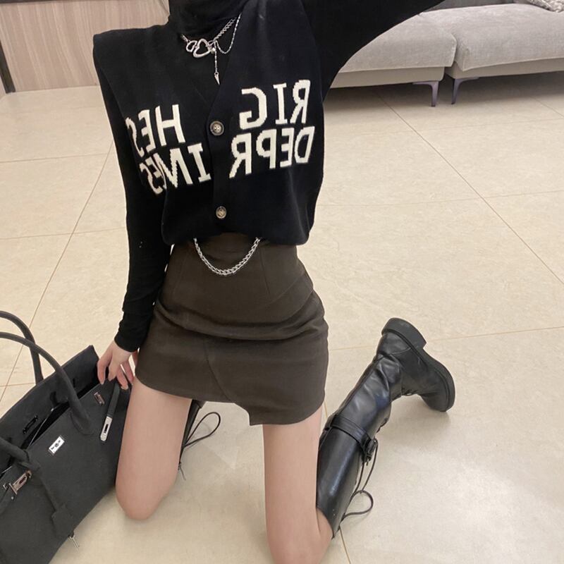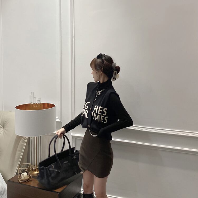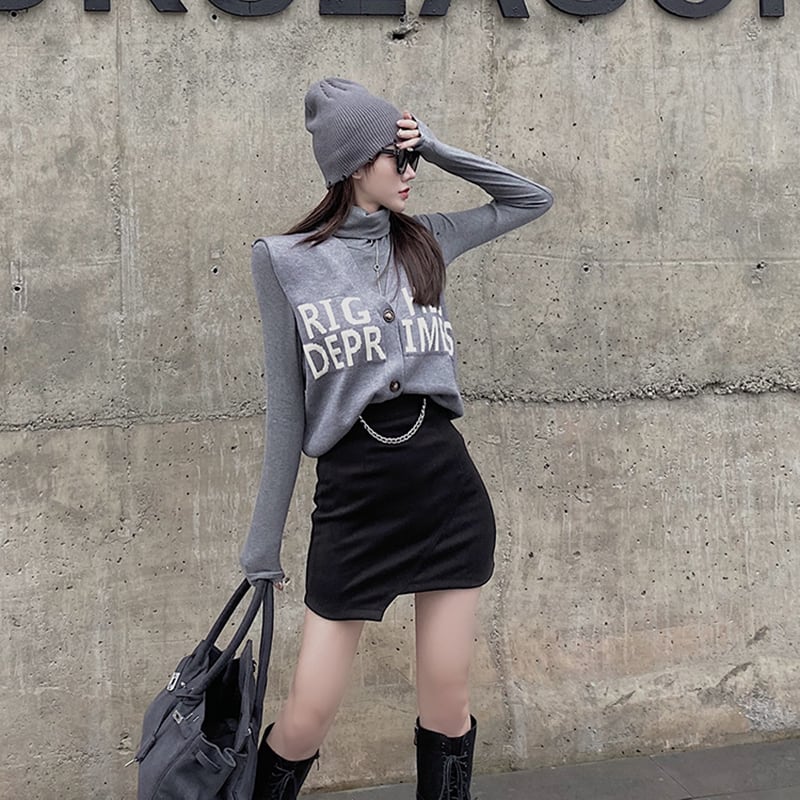 色:黒底シャツ,黒スカート,ブラックレターベスト,グレーのボトミングシャツ,グレーのレターベスト,コーヒースカート