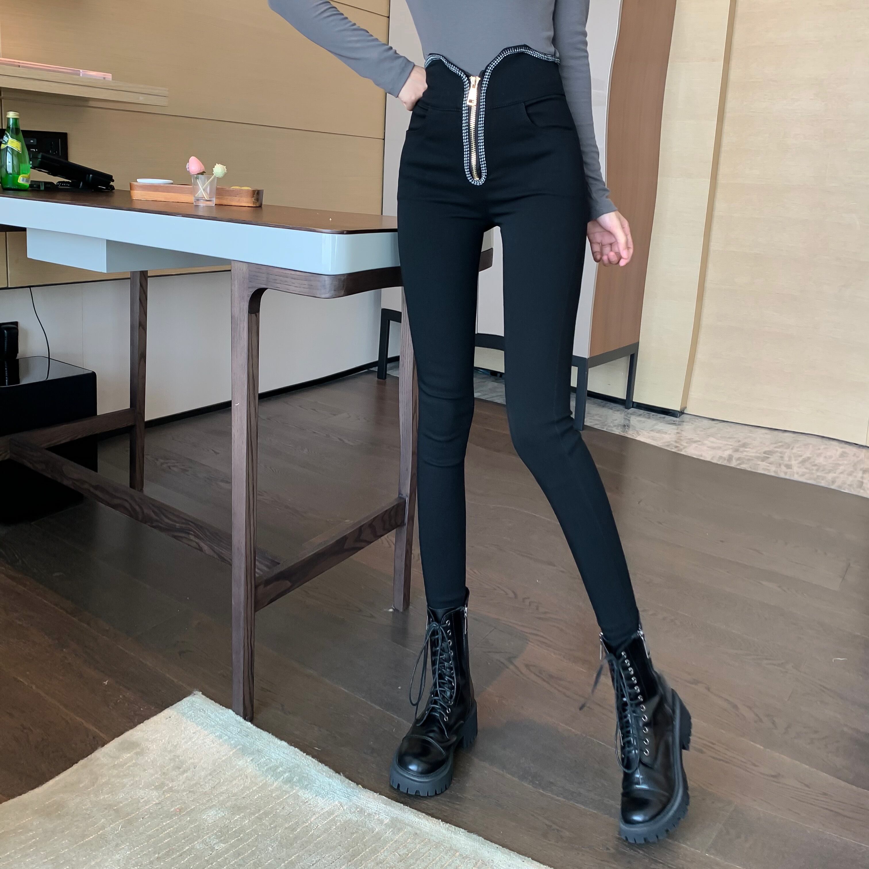 ブラックパンツ カジュアルスプリングオータムハイウェストウェスト薄手ジッパー 春物 秋物 セブンプリンセス76318027457
