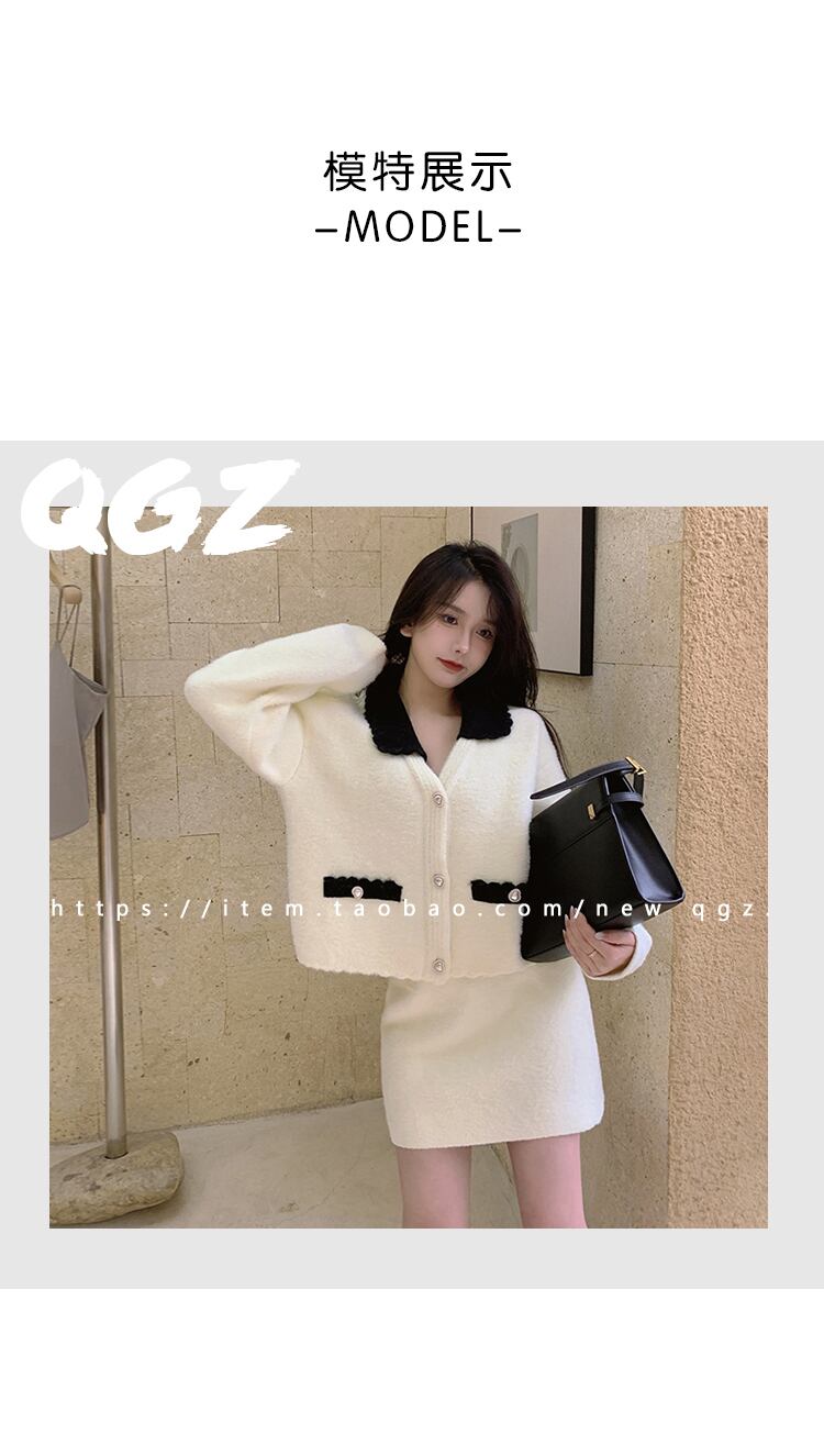 色:白と黒のステッチニットスカート,白と黒のステッチニットカーディガン