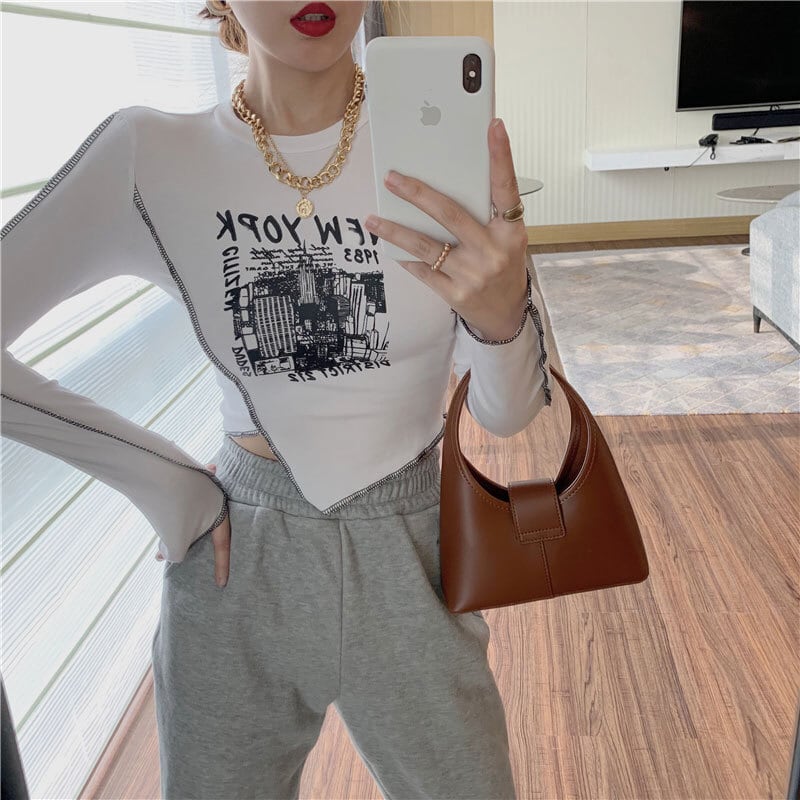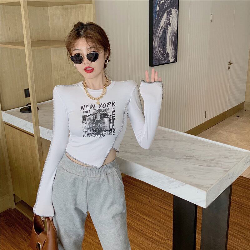 ブラウス オータムウィンタースリムショートTシャツ シャツ プリントラウンドネック ロング 秋物 冬物 Oネック セブンプリンセス51156556647